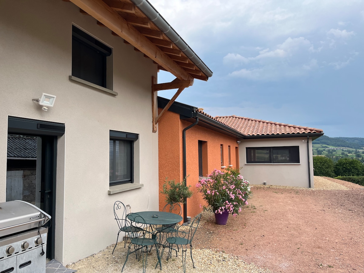Hyggeligt og roligt hus på landet. Nyd et ophold i det grønne med en åben udsigt over naturen. På 2 etager har I 2 soveværelser med dobbeltseng, en dobbelt sovesofa og to enkeltsenge på en hems. Adgang til vandrestierne direkte fra boligen. Kom og lad batterierne op og nyd nærheden til Beaujolais-regionen.