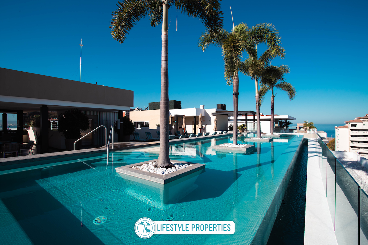 LUXURY a flight of stairs away from the beach! Enjoy SUNSETS from the ROOFTOP INFINITY POOL or YOUR PRIVATE JACUZZI & WATER VIEWS from EVERY room of this sub-penthouse (2 full bathrooms) that is located in AMAPAS 353, a newer development in the heart of the Romantic Zone close to many restaurants, bars, Blue Chairs, Mantamar & Almar. The building is small (21 units), has a daytime caretaker (no sign in/sign out) elevator, gym, rooftop kitchen w/BBQ & easy access to all the local highlights!