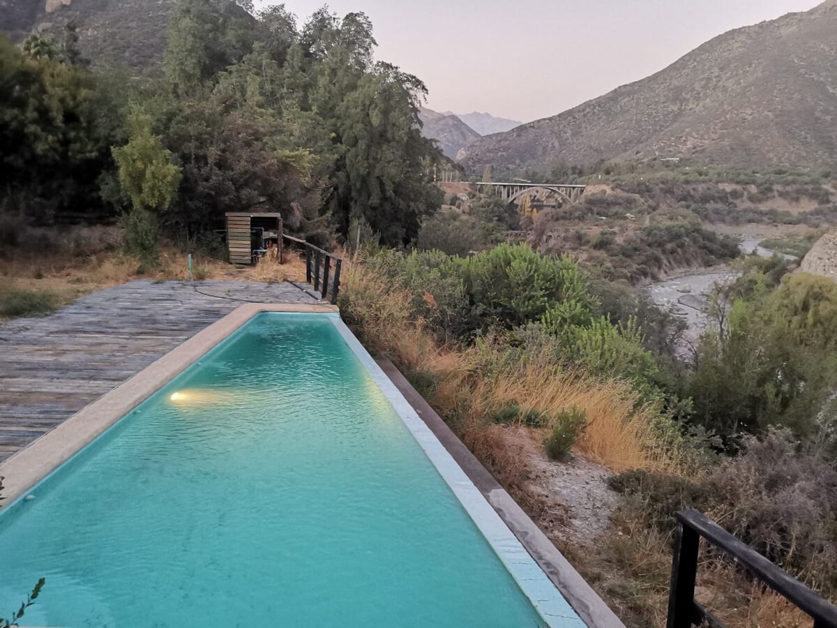 Magisk sted midt i bjergene, på flodbredden og kun 15 minutter fra Santiago. Pool og flod til sommer. Huset har en stor stue og spisestue med pejs, hvor man kan være sammen med familien. Vi har plads til asado, jordovn, hængekøjer og rolige steder at tilbringe eftermiddagen foran floden. Om aftenen kan du nyde stjernerne foran pejsen og hvile med floden hviske. Det generøse kolibrihus er ideelt til familier. Kom med en anden venlig familie.