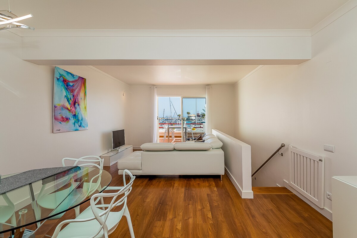 Lejlighed med 2 soveværelser, 2 badeværelser, gratis Wi-Fi, direkte adgang til marinaen, 1 gratis parkeringsplads. <br> <br>Fantastisk duplex-lejlighed med to soveværelser, to badeværelser, direkte adgang til Vilamoura marina, for ikke at nævne den fantastiske udsigt! <br >Gå ind i denne lejlighed, vi finder et opbevaringsrum på vores højre side, der går op ad nogle trapper, finder vi et af soveværelserne med et komplet badeværelse og et udendørs område med udsigt til marinaen.