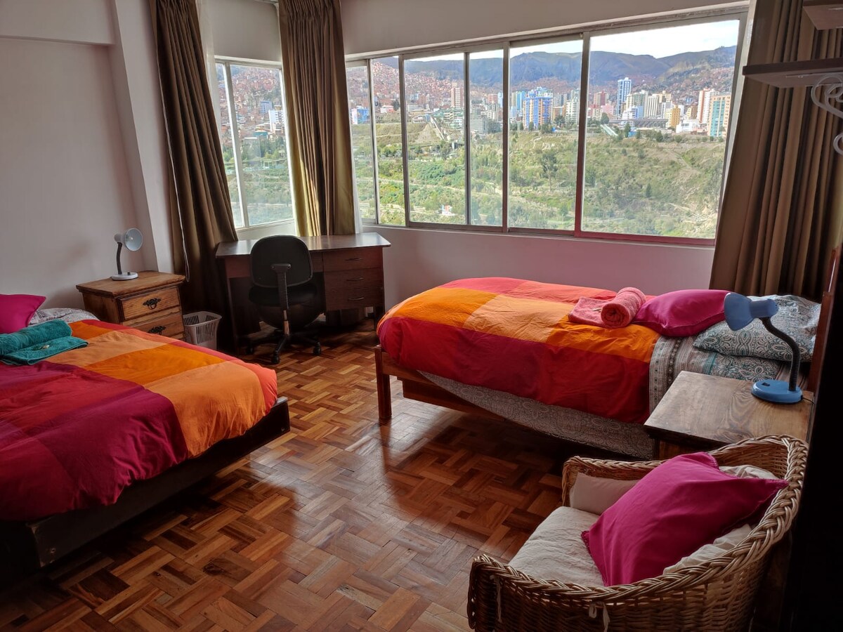 Penthause exclusivo con vista panorámica inigualable del "Illimani" y la ciudad. - Ubicado en el corazón de Sopocachi, cerca de supermercados, restaurantes y trasporte público. - Wifi 5G - Cocina independiente, Nexflix, lavadora y agua caliente. - Acceso seguro y privado con ascensores panorámicos y seguridad 24/7 1. Habitación principal cama QUEEN para 1 o 2 personas Dólares 38 (la segunda permanece cerrada) 2. Segunda habitación (opcional) cama doble disponible por 10 dólares por persona.