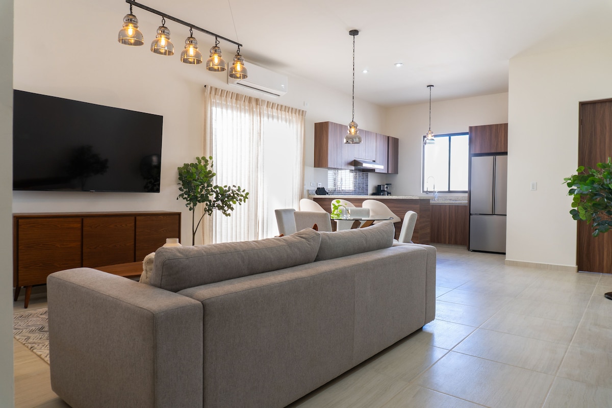 Comfortable, Private, and Secure! *Common pool with wifi, clubhouse, playground, 24-hour security. *2 bedrooms, 2 full bathrooms, 2 closets, 1 sofa bed. *A/C. *Kitchen, dining area, Smart TV. *Fast Internet - ideal for working. *Backyard patio, shade, and outdoor seating area. *Private parking. *Close to restaurants, walmart, cinema, bowling, bars. *17 minutes from the main boardwalk. *7 minutes from the airport. *Best way to get around is by rental car (Didi and Uber available in the area).