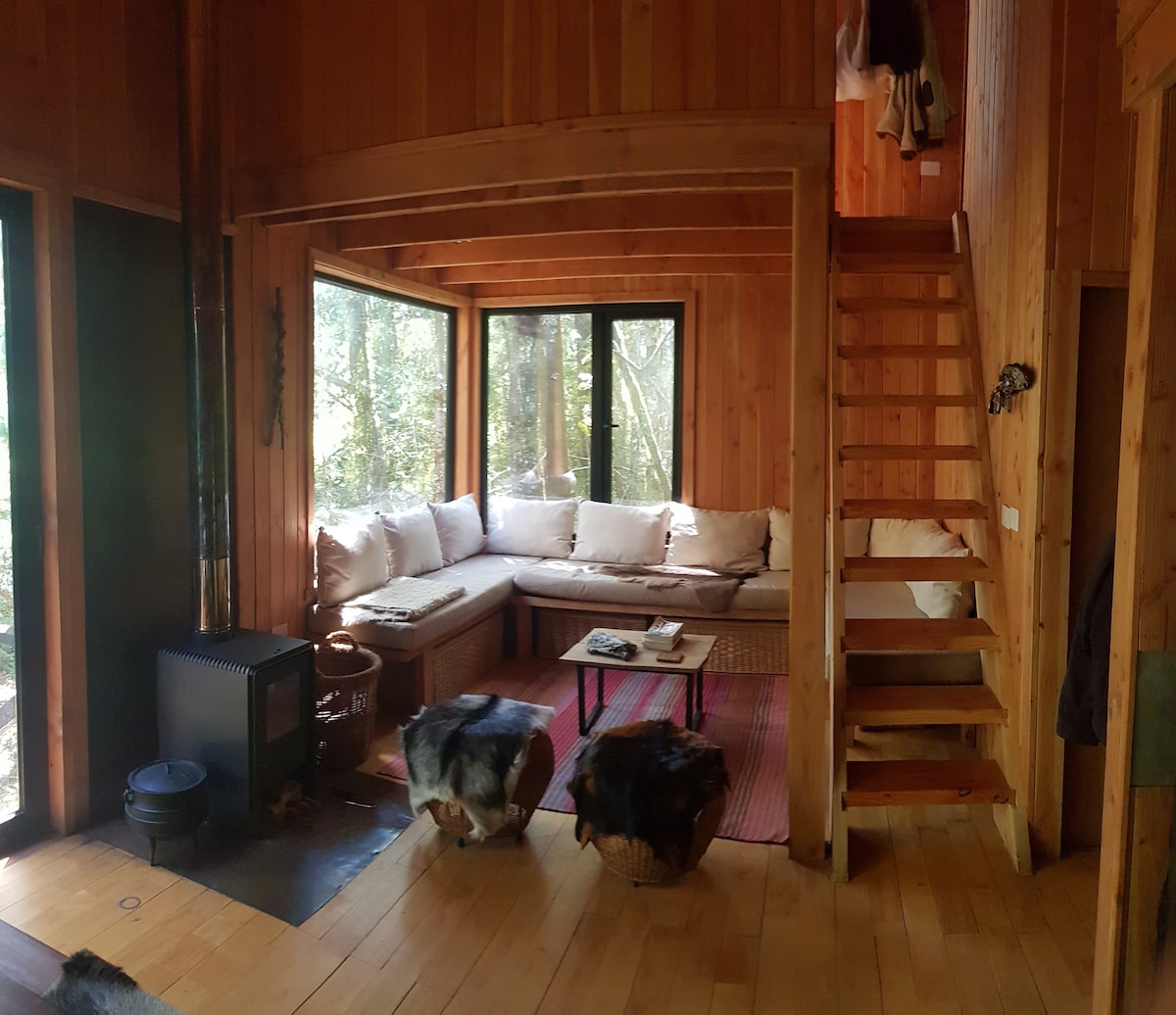Det er en rustik hytte af typen Tiny house (lille hytte), der er bæredygtig for 2 personer. MEGET VIGTIGT: Der er ikke noget tv, men der er en lille minibar, hårtørrer, køkken med brændeovn og aircondition med varme og køling. Det har et varmt badekar, der koster ekstra 40.000 pesos. Den er omgivet af træer, der er hjemmehørende i området, og er bygget i et forsøg på at opretholde balancen med omgivelserne. Der er en udendørs grill. 1,5 km væk ligger byen Río Puelo og 3 km væk ligger Termas del Sol