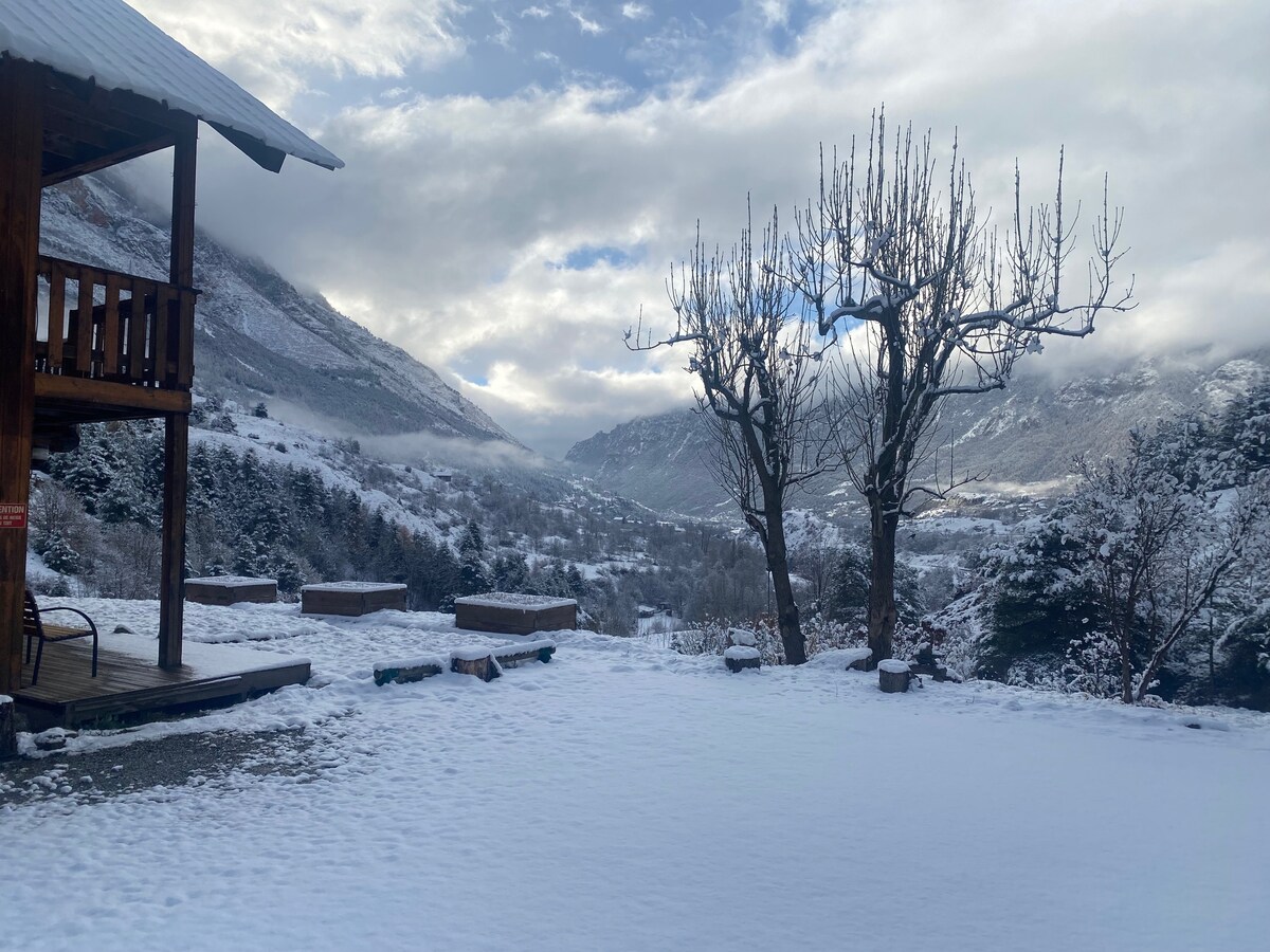 Vores hytte ligger i en rolig privat have. Dens terrasse på 30m2 giver dig mulighed for at nyde en panoramaudsigt. Gratis parkering. Vi har lagt særlig vægt på udstyr og indretning for at skabe en hyggelig atmosfære. 5 minutters gang fra centrum af Guillestre finder du: alle butikker, biograf, restauranter, supermarked. Ved porten til Queyras, Vars, Risoul, og Embrunais, vil dens geografiske placering give dig adgang til en ubegrænset legeplads, sommer som vinter.