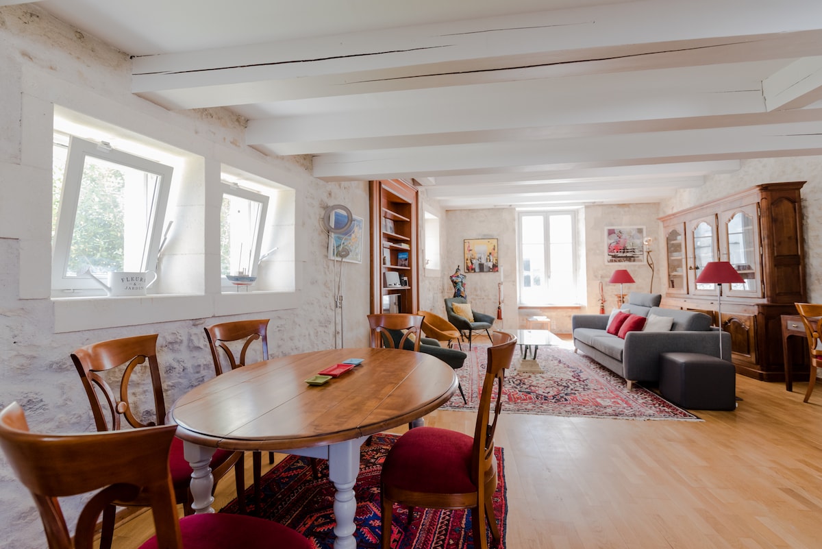 Nyd en stilfuld og central bolig. Denne smukke duplex, der ligger i en typisk Rochelais-bygning, et stenkast fra Place de Verdun, det centrale marked og den gamle havn, vil glæde dig. Kom og læg dine kufferter i total ro, og nyd denne omhyggeligt renoverede bolig med alle bekvemmeligheder, lyse og atypiske. Elskere af gamle sten, nyder også den nærliggende park, shopping og smukke kulturelle og gastronomiske opdagelser i byen.