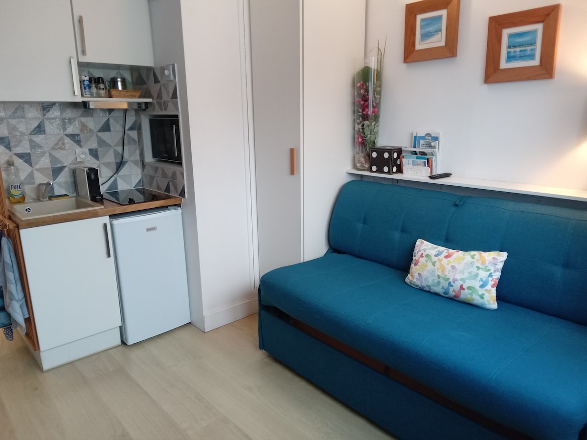 Beliggende på Pointe des Minimes, direkte mod havet og strandpromenaden, sydvendt, stille omgivelser, 400 m fra stranden og butikker. 1. og øverste etage i en lille bolig. MAKSIMAL KAPACITET 2 VOKSNE 28 m2 + 7 m2 soveområde, maksimal loftshøjde 1,65 m. Stue med 140 sovesofa. Stort buet vindue med rækværk for at nyde udsigten. - For at komme til den gamle havn, bus 200 m væk og flodbus 600 m væk. Cykelstier. LANGVARIGT OPHOLD MULIGT på anmodning, afhængigt af tilgængelighed.