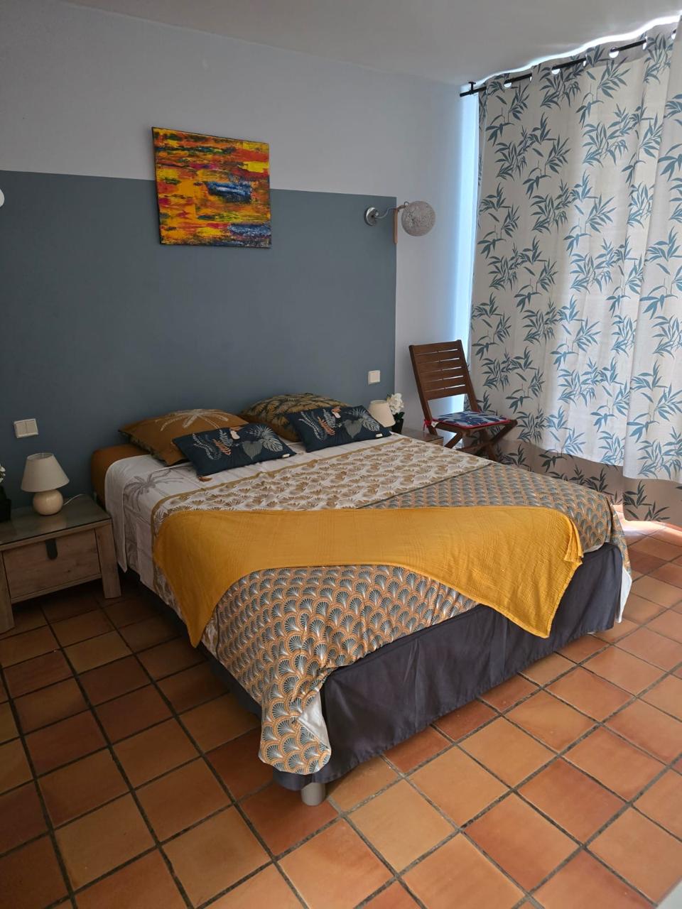 1 lit double + 1 petit lit, Climatisé, ventilé, étagères, penderie; TV, Wifi, Kitchenette: (cafetière, grille-pain, cuiseur..) Coin repas sur balcon avec magnifique vue mer, Salle d'eau, lavabo, douche et WC Linge de maison (1 grande et 1 petite) serviette en dépannage, location serviettes supplémentaires, peignoirs et sèche-cheveux à la demande Lave-linge extérieur partagé, Terrasse couverte Accès piscine, bbq, cuisine extérieure : four, grill, crêpière à la dde NON FUMEUR Intérieur & ext.