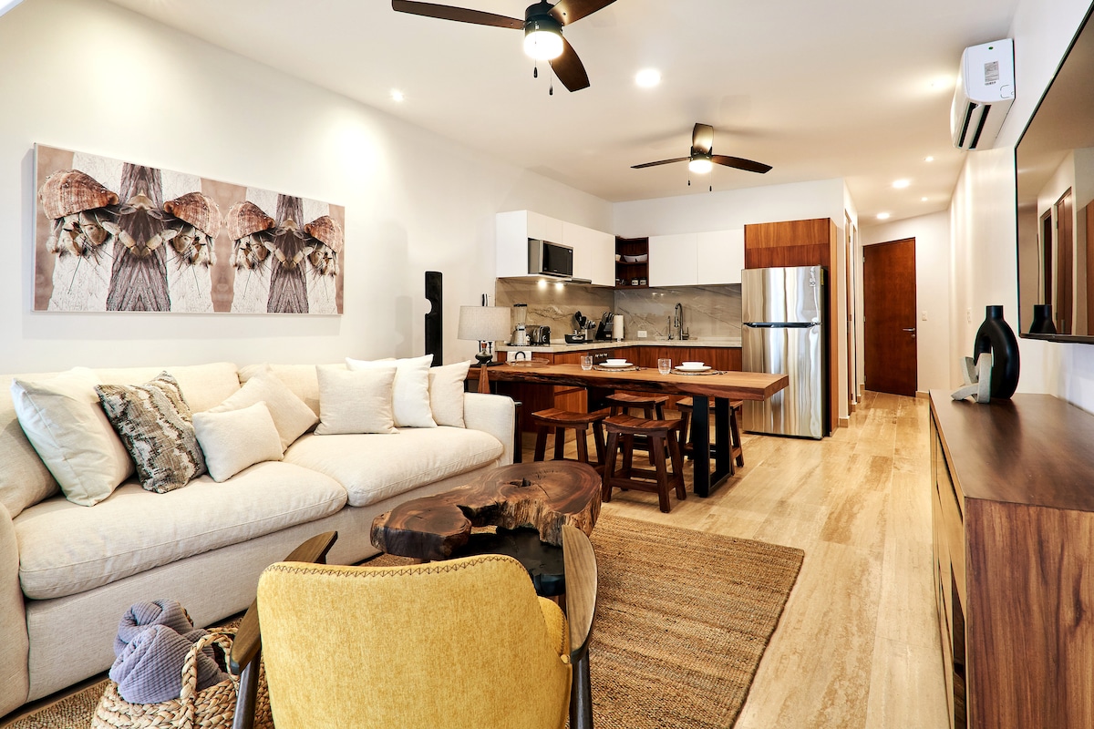 Welcome to your MayanKey hideaway in Tulum — a stylish 2-bedroom apartment designed for comfort, ease, and a relaxed connection to its natural surroundings. The open-concept living space, fully equipped kitchen, and private balcony create the perfect setting for slow mornings and easy evenings at home. Both bedrooms feature queen-size beds and ensuite bathrooms, making this an ideal choice for couples, friends, or small families seeking a calm and well-appointed stay.