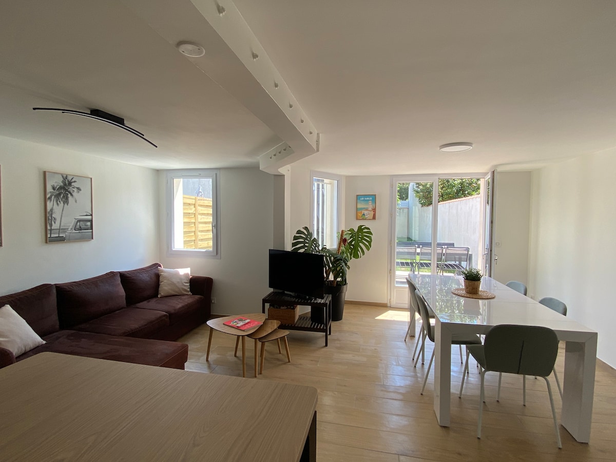 Velkommen hjem, 15 minutter fra stranden! Vi har valgt at indrette en uafhængig suite, der er en del af vores hus, for at byde dig velkommen og give dig mulighed for at besøge vores smukke region. Indenfor i din bolig er alt designet, så du kan føle dig hjemme. Vi byder dig velkommen i en ny bolig på 60 m², der vender mod syd, i et roligt kvarter. Der er en lukket parkeringsplads til din bil.