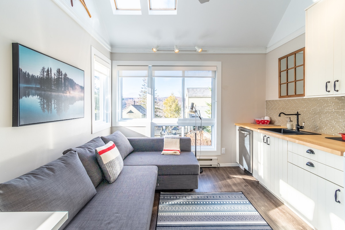 Du vil være tæt på alt, når du bor i vores centralt beliggende lejlighed! Ren, stilfuld med alt, hvad du har brug for til et afslappende ophold i Mont Tremblant. Beliggende lige ved siden af gågaden, 5 min. gang til liftene. Queensize-seng i det store soveværelse, og det luftige loft har to enkeltsenge og en dagseng, der kan åbnes til en kingsize-seng. Alt er til rådighed, herunder tallerkener, gryder, håndklæder og sengetøj. Parkering til 1 køretøj lige foran, et andet køretøj kan være på den nærliggende hovedparkering.