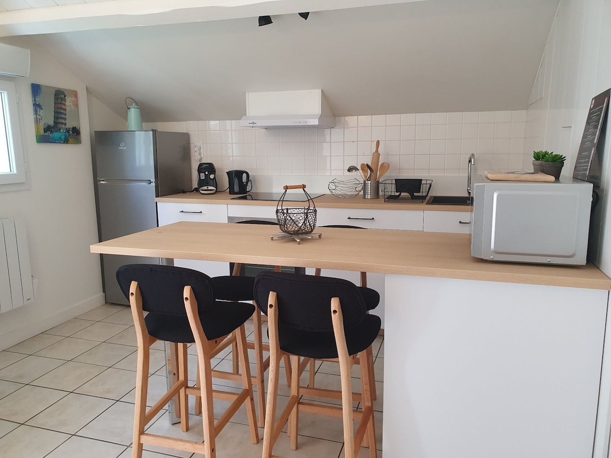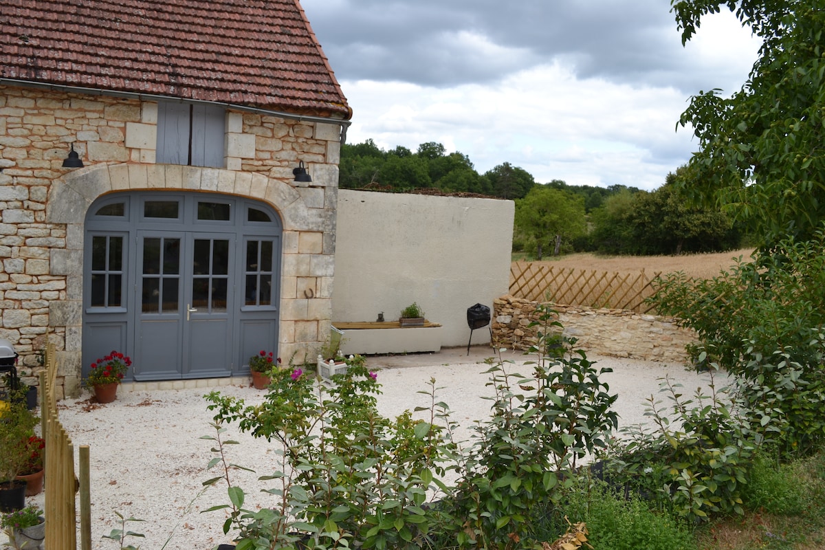 Denne 35 m2 store lejlighed ligger i en fuldt renoveret lade fra det 19. århundrede, så du kan bo i et behageligt område. For 2 voksne + en baby (gratis babysæt efter anmodning) kan du nyde en indendørs pool (funktionel og opvarmet hele året rundt) og en have, der deles med de 4 andre boliger. Fuldt udstyret køkken, opvaskemaskine, vaskemaskine. Butikker og kanobaser ved Dordogne-floden 200 m væk. Sengetøj og håndklæder kan lejes.