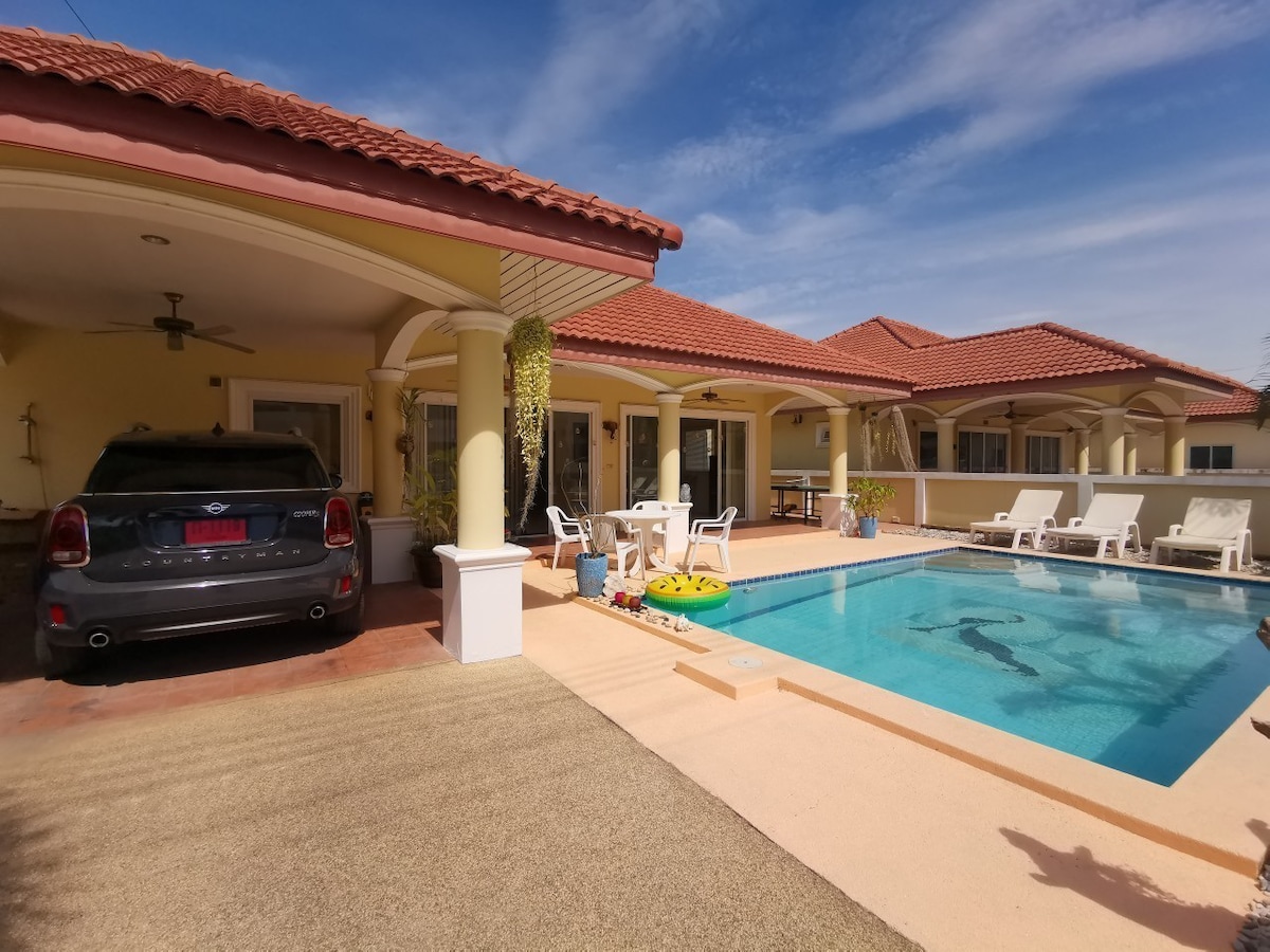 Come and stay with us at this superbly fully furnished 2 bedroom en-suite pool villa with jacuzzi , fully furnished with everything you need for a superb stay . Private, safe and a quiet area located in the quiet village of Suan Romruen village , 10 kms to central Pattaya , 12 kms from Sri Ratcha and 5 mins off main Sukhumvit Road, easy access to motorway and highway 36 If you like peace and quiet this property will be for you , many shops and shopping centers near bye and restaurants . Emma x