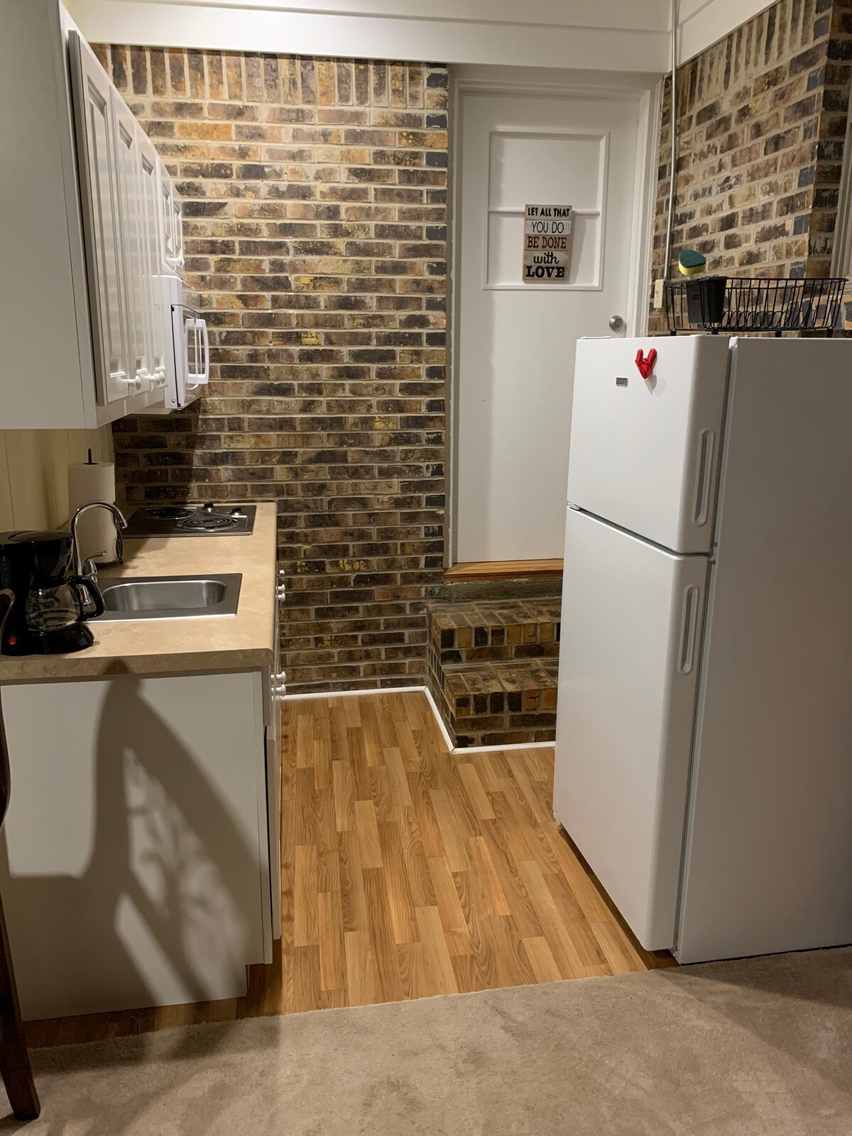Rummelig atelierlejlighed med 10 fods lofter og høje vinduer, der gør den lys og luftig. Beliggende i et roligt, skovklædt kvarter kun 10 minutters kørsel fra campus eller pladsen. Queensize-seng, dobbelt liggestol, skrivebord, spisebord, vaskemaskine/tørretumbler og køkken med køleskab, mikrobølgeovn og komfur. Privat udendørs terrasse, der er indhegnet. Personlig dørlåskode for ekstra sikkerhed. Roku TV og gratis WiFi.