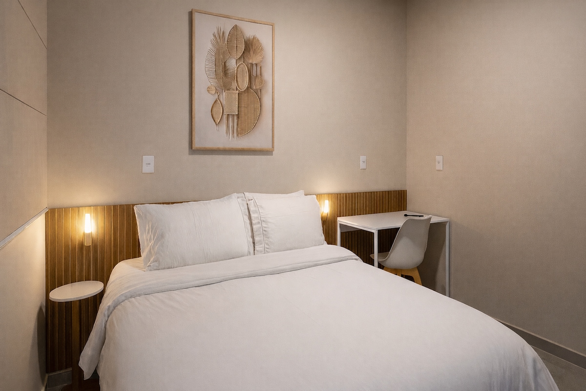 I Jurerê - den mest berømte strand i Florianópolis, roligt hav, smukke landskaber og restauranter. Du får privatlivet i en moderne lejlighed med bekvemmeligheden af et 5-stjernet hotel, herunder daglig rengøring. Perfekt til par, enkeltpersoner, forretningsrejsende og familier (med op til to børn, hvoraf det ene kan sove i en barneseng). Kun de valgfrie hotelydelser: restaurant, morgenmad eller parkering med parkeringsservice betales direkte til hotellet.