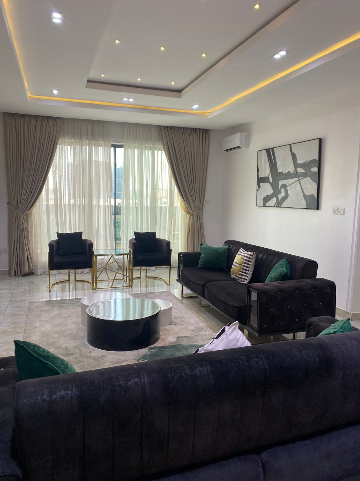 Velkommen til Elmstead Luxury Aprt, dit stilfulde fristed i Lekki Ikota. Denne oase med 2 soveværelser/2 badeværelser tilbyder komfortabel aircondition, et 65" tv i stuen, 43" tv i soveværelserne, gratis stabil ubegrænset wi-fi og 24/7 strøm med inverter og solenergi. Få adgang til indtjekning med smartlås, gratis parkering, vaskemaskine i boligen og et hoppeborg til børn. 1 gratis rengøring for ophold på over 5-6 nætter. Tæt på Lekki Conservation Center, Mega Chicken, Blackbell & Blemco. Perfekt til solorejsende, forretningsgæster, familier eller længerevarende ophold