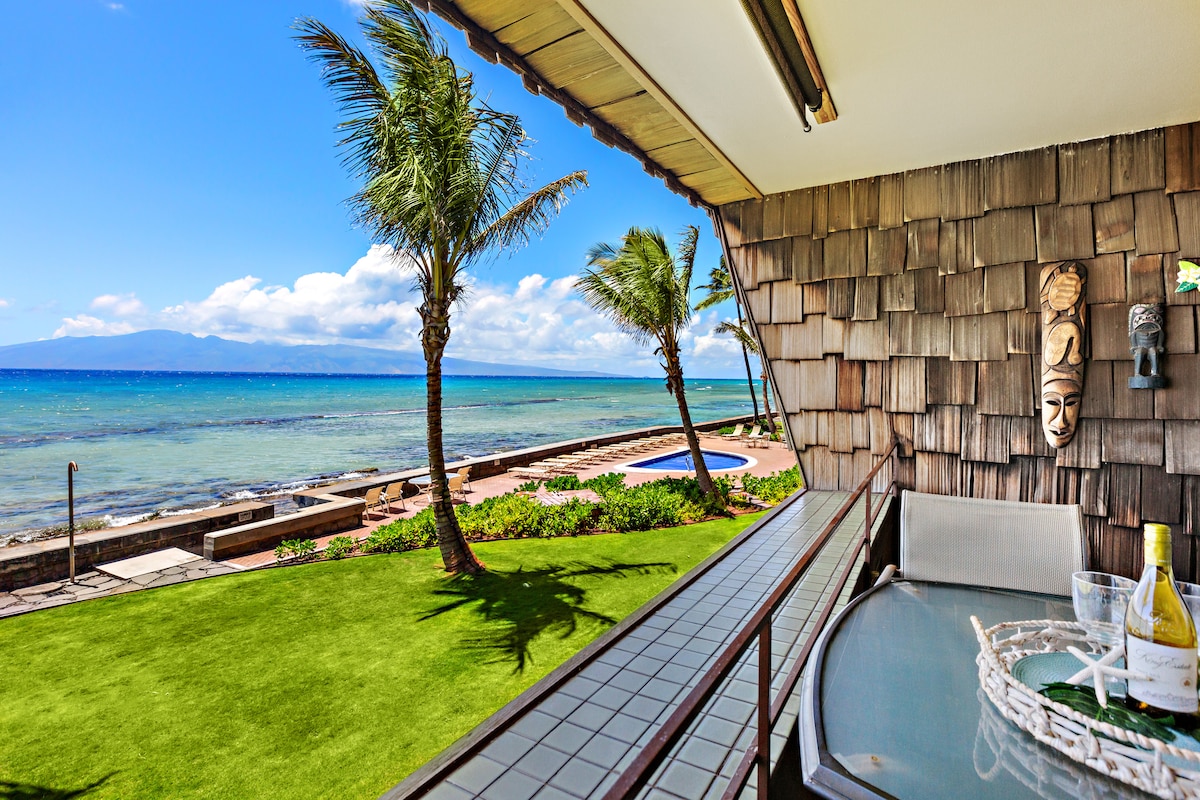Lokalt ejet og drevet 1BD/2BA lejlighed med den bedste direkte beliggenhed ved stranden, panoramaudsigt over havet, solnedgange og sæsonbestemt hvalskue. Ejeren har ikke sparet på noget i forbindelse med renoveringen af denne enhed, hvilket gør den til en af de flotteste enheder i hele Mahana. Vågn op til den kølige tropiske brise og lyden af kystlinjen kun 15 meter væk. Vinduer fra gulv til loft i stuen og soveværelset bringer den fantastiske udsigt og varme Maui-sol ind, mens central aircondition holder dig kølig indenfor.