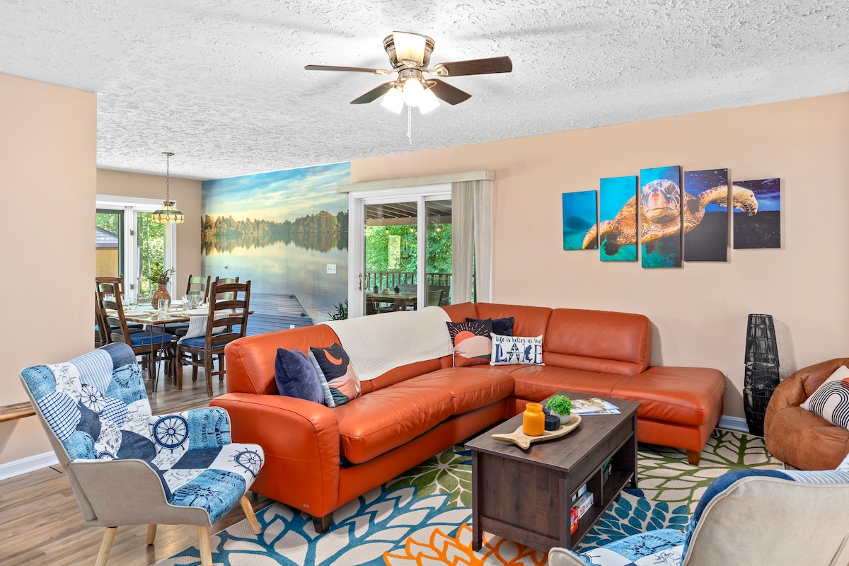Stepping Stone Cove er din families perfekte sted for naturskøn udsigt, svømning, fiskeri og sejlads. Dette smukke hjem ligger i en stille bugt og har en åben stue, 2 pejse, 4 soveværelser, 2,5 badeværelser, opholdsstue og kontor. Udenfor finder du en afskærmet veranda, oplader til elbiler, terrasse og terrasse med hængekøje og spabad med udsigt over søen for ultimativ afslapning. Gå ud af bagdøren til vores private kaj og adgang til søen. Centralt placeret, aircondition, wi-fi og hundevenlig, 9 minutter i bilen til dagligvarer i centrum.