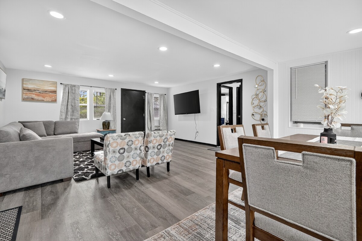 Nyd denne nyligt ombyggede lejlighed på 1.100 kvm! Ved siden af min bygning på 13.000 kvadratfod ligger min tidligere udlejerbutik og underholdningsrum. Jeg flyttede for nylig til en anden bygning og besluttede at gøre den til en Airbnb-bolig. 120" Screen Soundbar - 24/7 65" og 50" med højttalere Stående skrivebord med skærm + printer Sammenklappelig fjeder og en 4" sammenklappelig madras. Smart home 1 King Bluetooth-højttaler Lille privat terrasse + stor murstensterrasse. Adgang til tagterrasse med lounge (gebyr) Gratis kaffe, sukker osv.