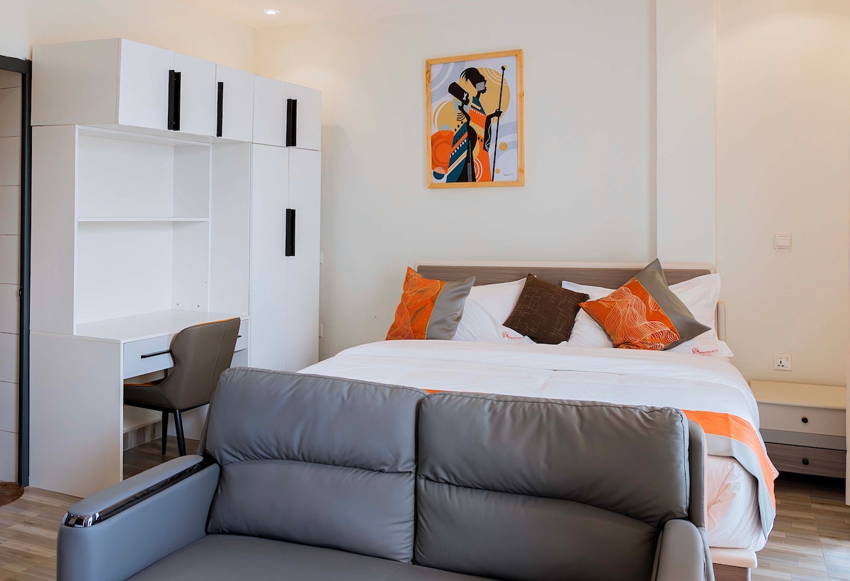 Dette er en selvstændig lejlighed med et soveværelse med egen indgang, der ligger til venstre for dette bygningskompleks. Nyd en stilfuld oplevelse på dette centralt beliggende sted i Kanombe nær Kigali International Airport og Kanombe Military Hospital og andre vigtige virksomheder.