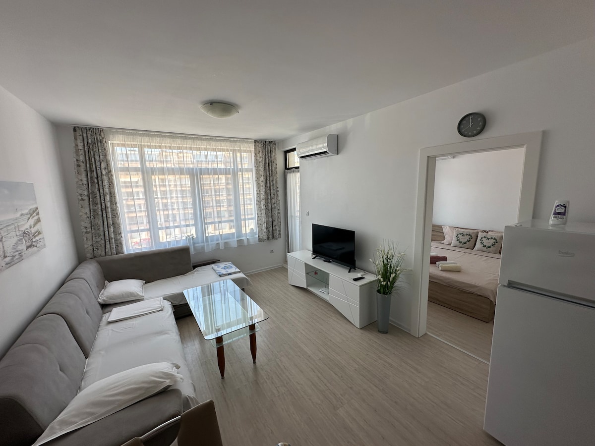 First line - just a minute away from the beach. Magnificent view. The apartment is with fully equipped kitchen, one bedroom with double bed, Flat screen TV with satellite channels, spacious living room with sofa bed for sleeping, a terrace with a beatuful sea view. The apartmentis located in a new building, the aria is quite and nice.