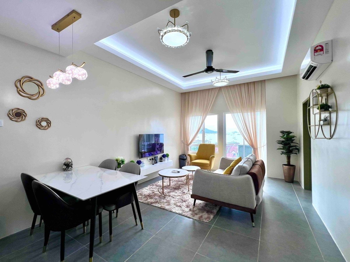 🎊 Velkommen til BlueSky Seaview 3Bedrooms Homestay. 🔔 En hjørneplads Apartment Homestay. Wi-fi 6 i hjemmet – hastighed på 300 mbps, 🔔 Strategisk beliggenhed af turiststeder med fisk og skaldyr/lokale restauranter, shoppingkomplekser, fastfoodbutikker, seværdigheder. 🔔 Værelset har grundlæggende køkkenudstyr som køleskab, mikrobølgeovn, gøgvandsbeholder og basale madlavningsartikler. 🔔Soveværelserne har en dobbeltseng med tatami-latexmadras. 🔔Vaskeri vi tilbyder vaskemaskine og tørretumbler