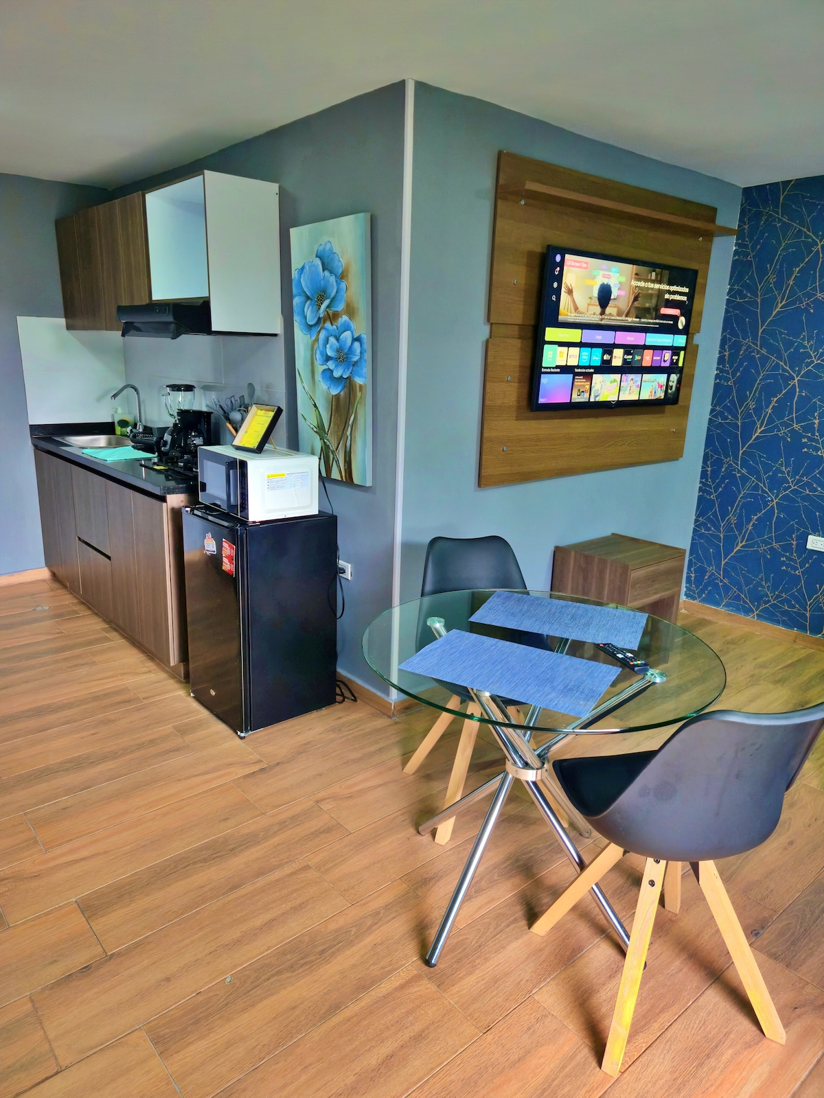 Moderne, hyggelig og superudstyret, perfekt til ferie eller arbejde 💼☀️.Beliggende foran C.C. Único 🛍️, i et roligt og centralt område med apoteker, supermarkeder, mange restauranter 🍽️ og busruter 🚍.På første sal er der en lokal madrestaurant 🍲.Lejligheden er meget cool 🌬️.18-20 min fra Malecon og statuen af Shakira 🎶, og 25 min fra Mallorquín-sumpen og Puerto Mocho 🌅.