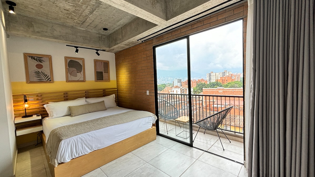 Nyd dette smukke loft på 6. sal med balkon og udsigt over byen i bygning 30 Living. Det er tæt på Mall Los Molinos, University of Medellin og Medellin Clinic, et par blokke fra Laureles Park, hvor du finder restauranter og barer for enhver smag. Overfor metrostationen plus La Palma. Tagterrasse med fælles brug af jacuzzi og kontorfællesskab. 24-timers reception, digital lås, indtjekning uden vært. Velkommen til Medellín, dit hjem væk fra hjemmet.
