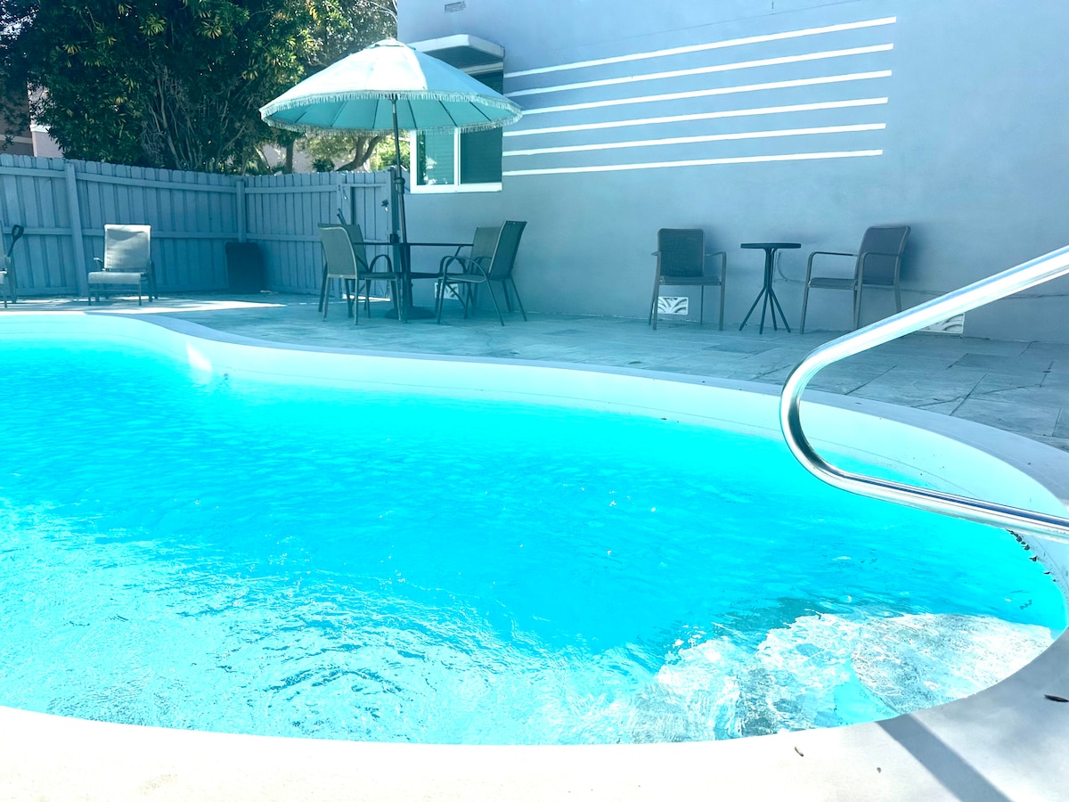 Welcome to our charming poolside studio apt. This delightful space is perfect for a couple or solo traveler seeking a relaxing and convenient getaway. With a fully equipped kitchen, queen-size bed, full-size bathroom with a stand-up shower, and all your beach essentials provided, From towels and chairs to an umbrella and cooler, we've got you covered. This studio apartment offers everything you need for a comfortable and relaxing vacation.