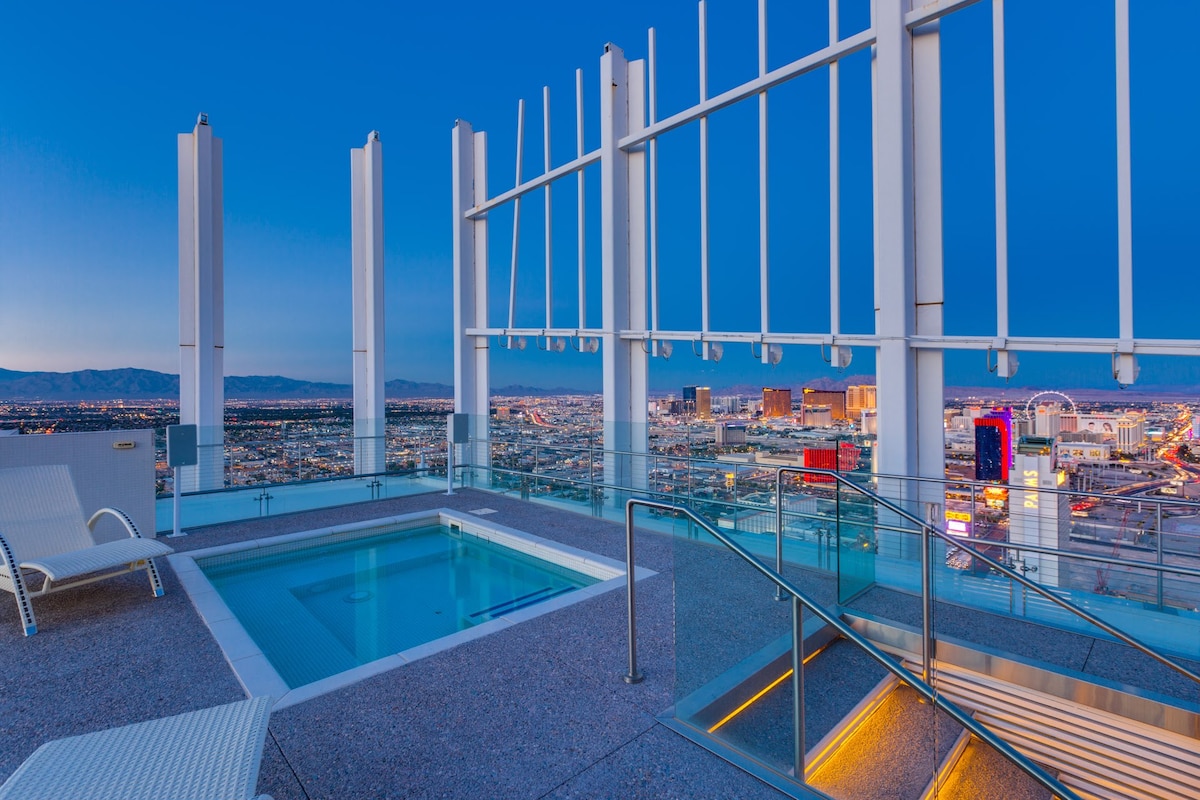 Experience 57th-floor luxury in this 3,300 sq ft Palms Place Penthouse featuring a private terrace Jacuzzi overlooking the Strip. Enjoy two bedrooms (king, pull-out sofa + two queens), two spa-style bathrooms, full kitchen, pool table, poker table, and modern living areas with panoramic views. Guests receive 24/7 StripViewSuites support plus full access to Palms spa, pool, gym, valet, and concierge for a resort-caliber stay. *The pool is closed for the winter season (October through March)*