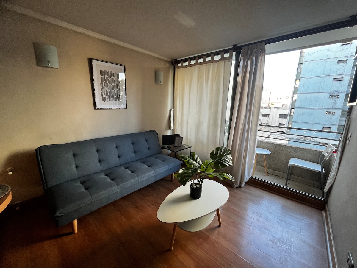 Denne lejlighed er ideel til at slappe af og nyde byen. Den er centralt beliggende mellem distrikterne Santiago Centro og Providencia, en af de bedste beliggenheder i byen. Den har en smuk udsigt over San Cristóbal Hill og Sky Costanera. Den ligger kun 3 minutters gang fra metroen og busserne. Inkluderer: Gratis wi-fi, et fuldt udstyret køkken, sengetøj og håndklæder inkluderet, en stor seng med et stort smart-tv. Selvbetjent indgang med en nøgle, så du kan ankomme når som helst.