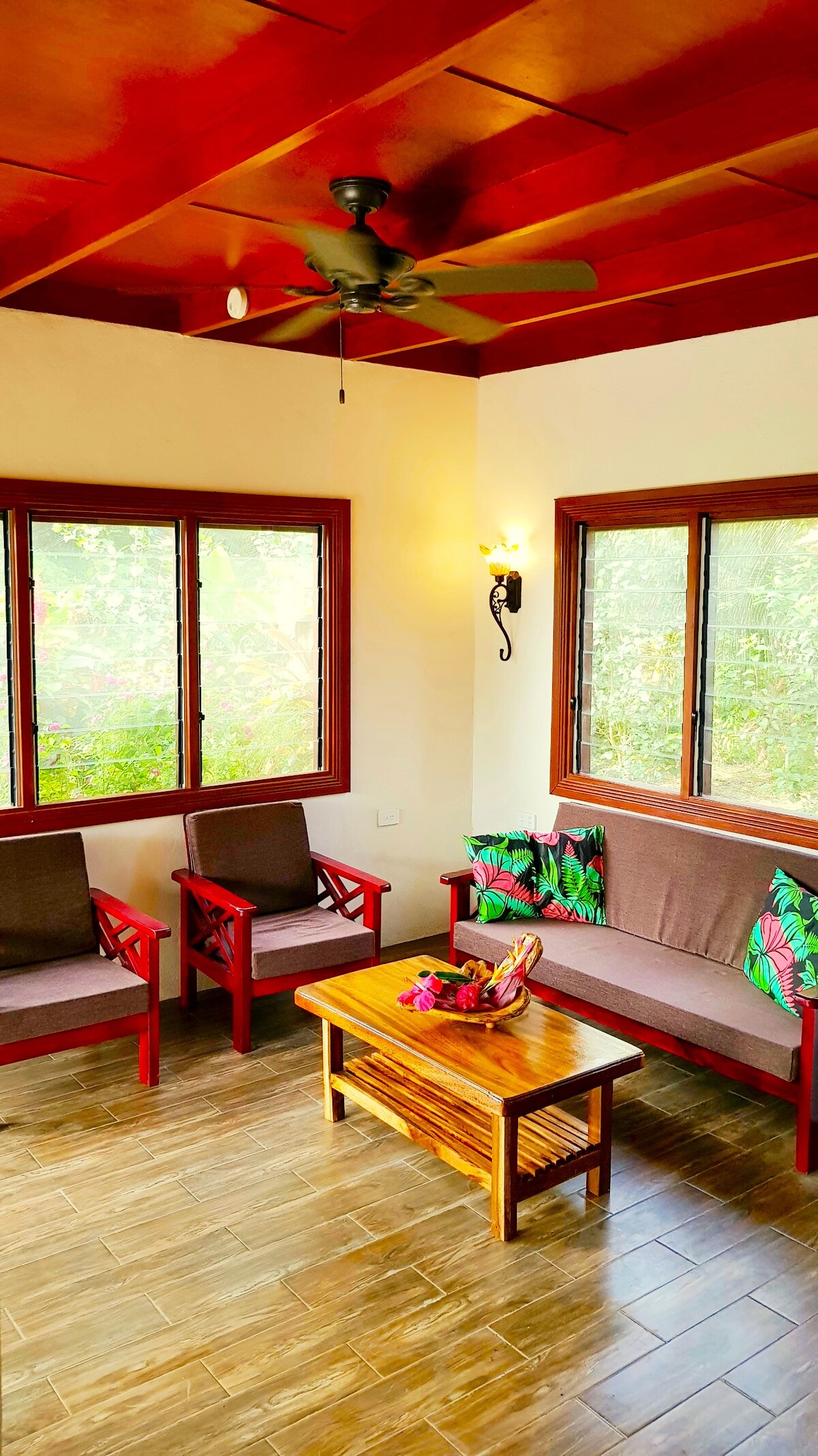En Eco Home-oplevelse uden indlagt strøm lige ved vandet! Vores arkitektonisk designede bolig med tre soveværelser har alle bekvemmelighederne i en moderne livsstil, samtidig med at den tilbyder fred, ro og skønhed ved at bo på øen. Boligen ligger på vestkysten af Taveuni-øen og kan prale af sin egen vandfront med en sikker svømmebassin, tropiske fisk og bløde koraller lige uden for døren. 3 soveværelser med queensize-senge + 2 x sofa/klappelige senge Fuldt udstyret køkken og kaffemaskine Kajakker og spil