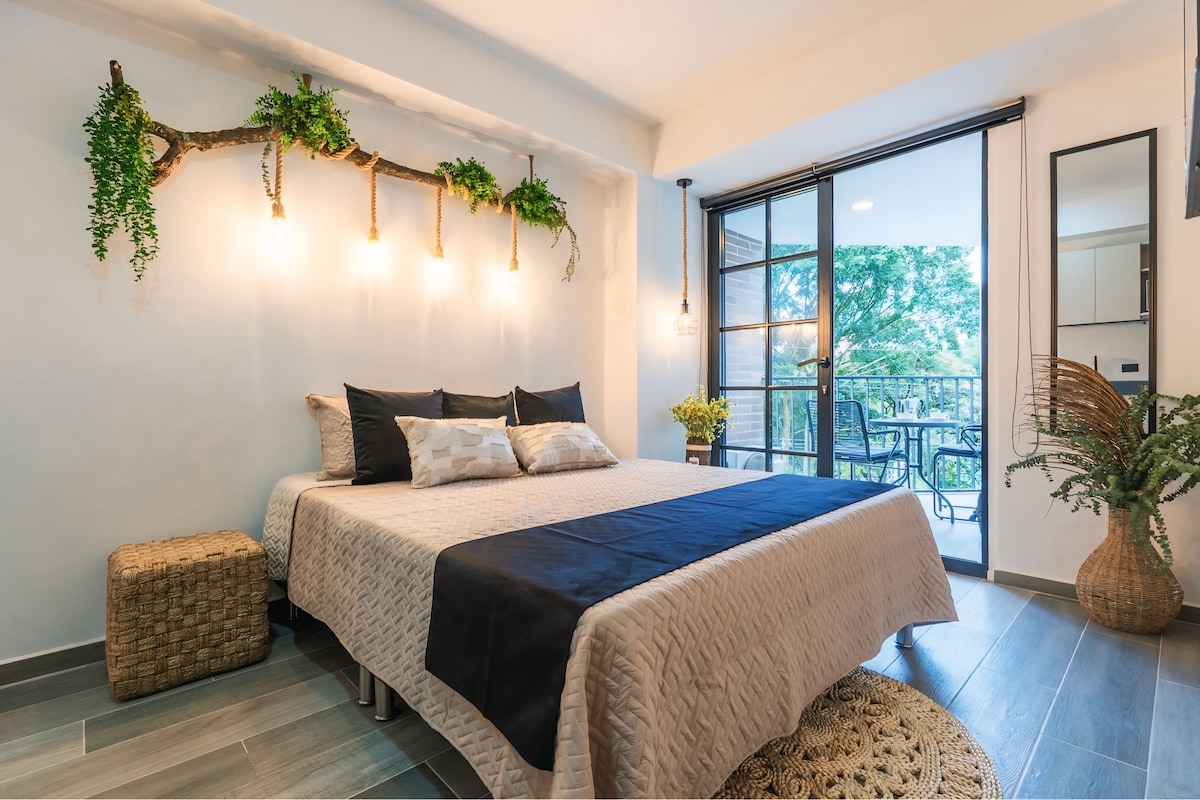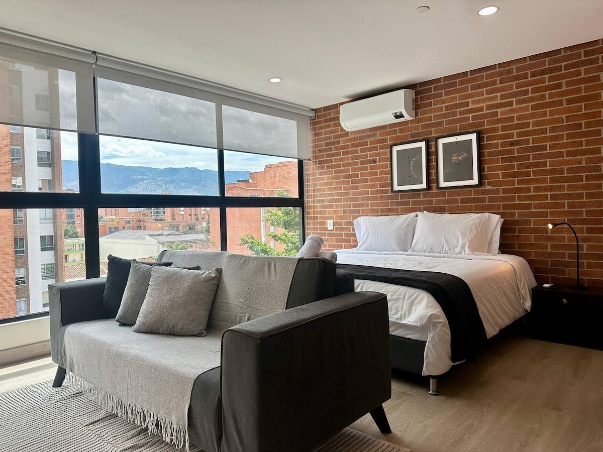 Light, Design & Local Living in the Heart of Laureles Welcome to a bright and peaceful loft designed for comfort, creativity, and connection. This space is perfect for couples, solo travelers or remote workers who want a stylish base in one of Medellín’s most authentic neighborhoods. 🛏️ Comfortable bed with premium mattress & 100% cotton sheets 💻 Dedicated workspace with fast 200 Mbps internet 🌬️ Air conditioning + natural cross-ventilation through floor-to-ceiling windows