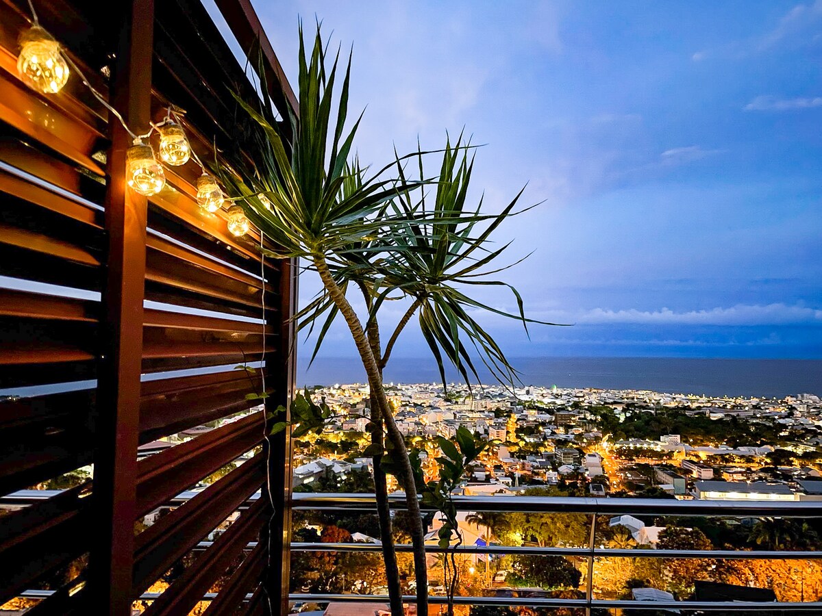 46 m2 lejlighed med en betagende udsigt over Det Indiske Ocean med sin enorme 37 m2 terrasse. Det giver dig mulighed for at stråle over hele øen fra dens hovedstad og at hvile fra dine intense dage med indtrykket af at flyde på himlen! Du har en queensize-seng i soveværelset og en sovesofa i stuen. Lejligheden ligger i en luksusbolig i hjertet af boligområdet Bellepierre. Universitetshospitalet i Saint Denis ligger i nærheden.
