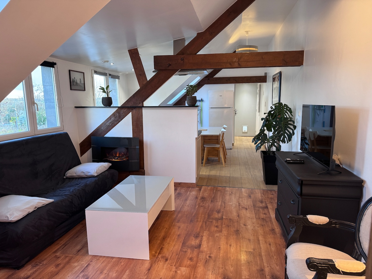 Lys og varm lejlighed under tagene, der kombinerer synlige bjælker og moderne indretning. Stort hyggeligt soveværelse med komfortabel seng, hyggelig stue med dekorativ pejs og uhindret udsigt, funktionelt spiseområde og udstyret køkken. Beliggende tæt på Loire-flodens bredder og dens havn, ideel til et roligt og behageligt ophold.
