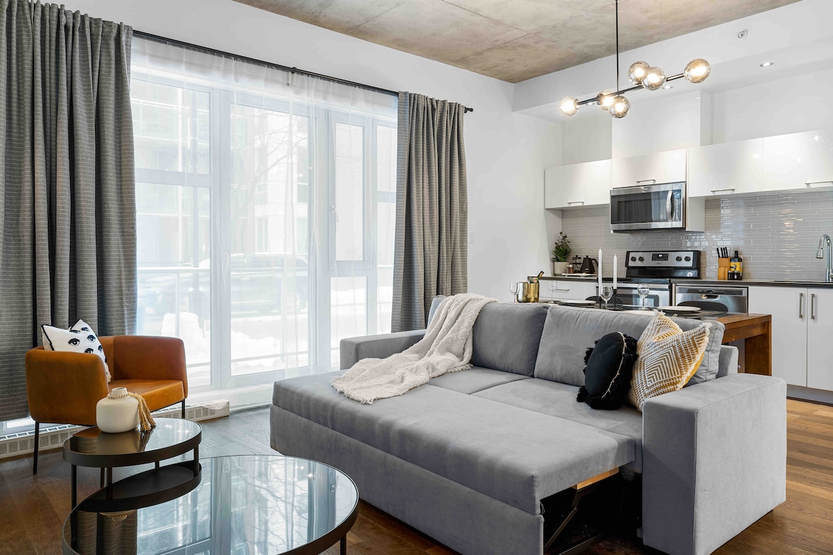Nyd Le Plateaus charme i denne lyse, stilfulde loftslejlighed. Naturligt lys strømmer ind i det åbne rum og fremhæver de blottede murvægge, de høje lofter og det moderne design. Træd ud og fordyb dig i et pulserende, kunstnerisk kvarter fyldt med trendy caféer, butikker og gallerier. Gå til de bedste restauranter, teatre, supermarkeder og markeder, metrostationer, cykelstier og Mont Royal – alt, hvad du behøver for et autentisk, uforglemmeligt ophold i hjertet af byen.🚲🍽✨
