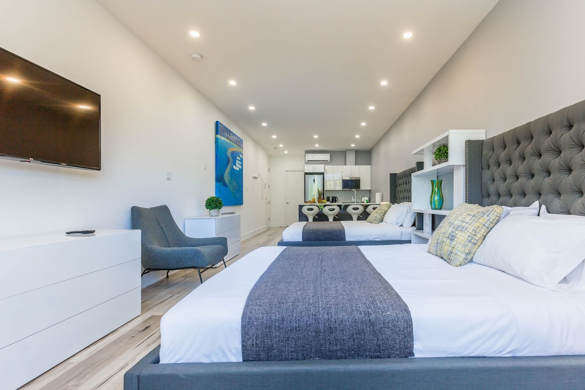 Velkommen til Mont-Royal Suites! Fantastisk sted for et autentisk ophold i Montreal! Denne splinternye lejlighed med 2 soveværelser ligger i hjertet af Montreals travle plateauområde. Du er i gåafstand fra nogle af byens bedste, og mest eklektiske, butikker, restauranter og barer. Denne luksuriøse lejlighed har 2 soveværelser + 1 sovesofa, 1 badeværelse, fuldt udstyret køkken, Nespresso-kaffemaskine og smart-tv. For ikke at nævne den fælles tagterrasse!