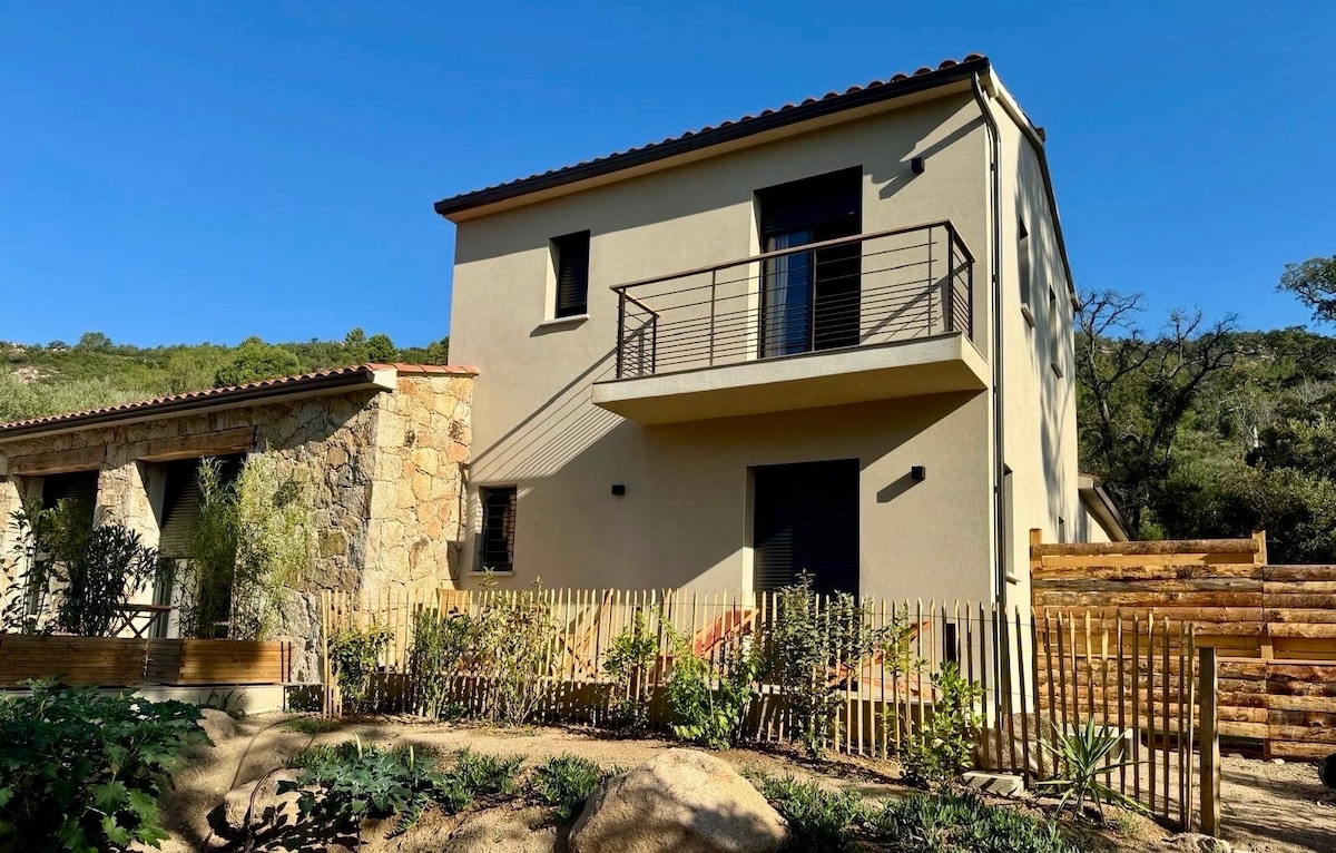 Nyt hus, der er indrettet med moderne møbler, aircondition, komplet udstyr, sengetøj og håndklæder. Sengetøj af høj kvalitet. Til dine øjeblikke af afslapning, dine grill-aftener, en skyggefuld terrasse med spiseplads og stengrill. Du har en parkeringsplads foran boligen Beliggende for enden af en blindgyde og ingen trafik 6 km fra byens centrum i Porto Vecchio og butikker, 10 minutter fra de smukkeste strande