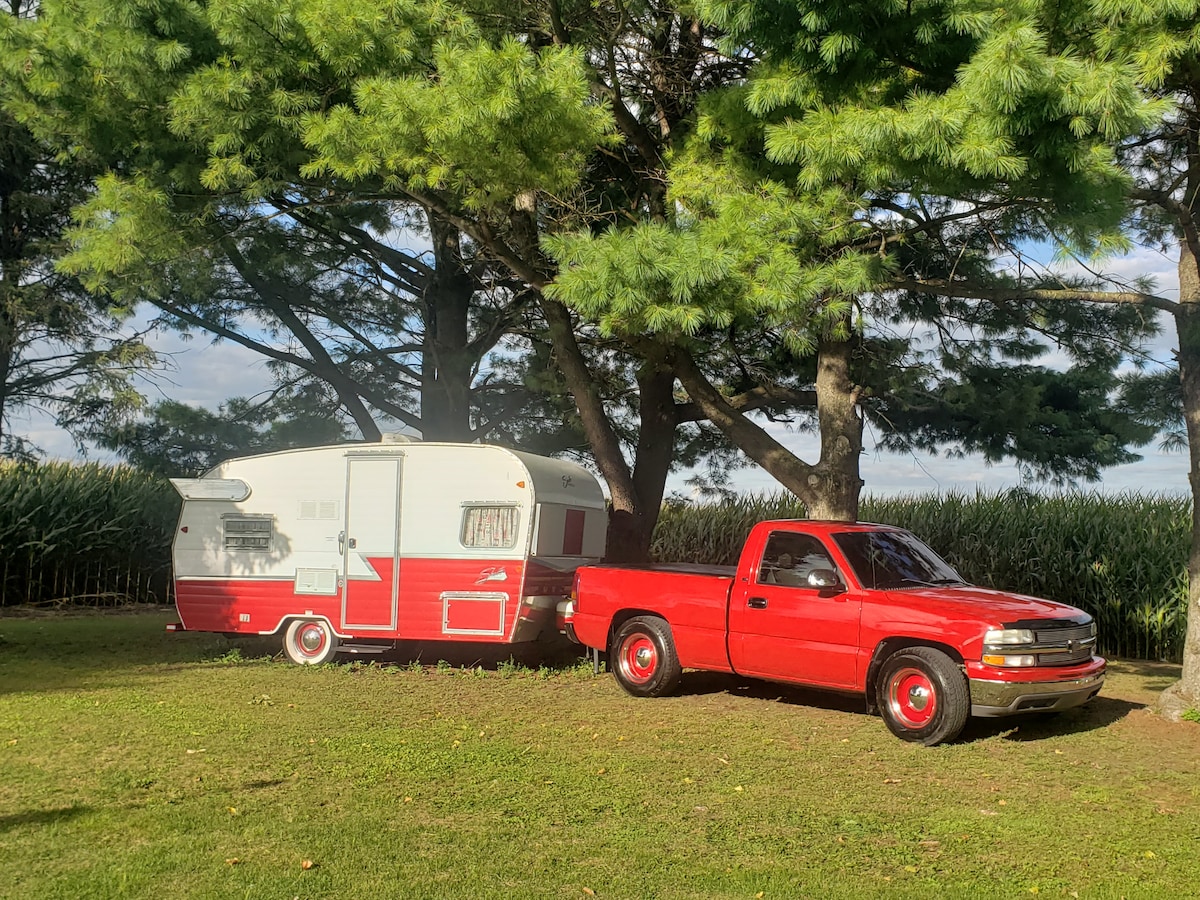 How often does one enjoy a glamping experience on the farm? Vintage Wings sleeps three snuggly. More idea for two. Enjoy your evenings around the bonfire, grilling up your fresh, caught fish! Romantic dinners await in the French, rustic pavillion. Slip away for your morning, quiet time within the temperature controlled Chapel. You'll find inspirational books, refreshments, a work space, and a cozy settee. Glampers are invited to take a dip in the pool, during guest hours.