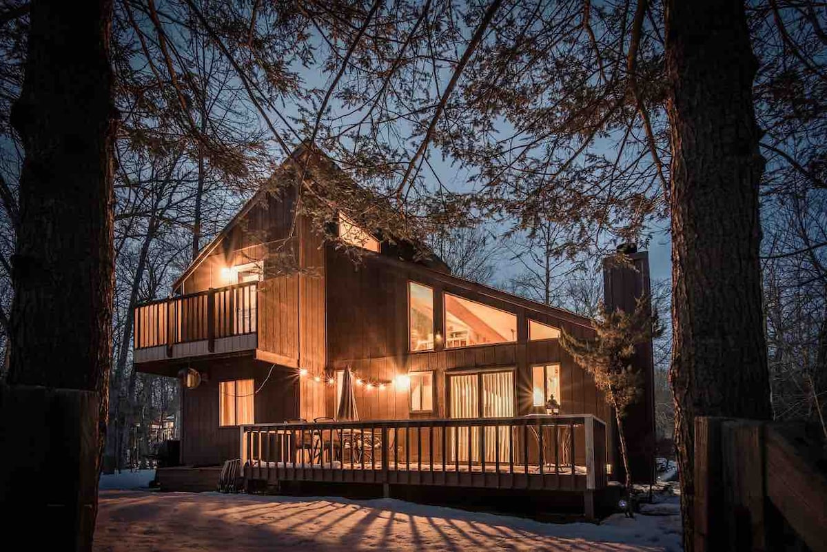 Din ultimative smuttur til Poconos venter! Dette familievenlige bjergsted har et fyldt spilrum, et spabad til 10 personer, en hyggelig gaskamin, højhastigheds-440 Mbps wi-fi og dedikerede arbejdsområder. Det er perfekt til afslapning og fjernarbejde. Nyd Pocono Mountains udendørs, stå på ski, snowboard, gå på snesko, spil paintball og indendørsgolf. Nyd gratis adgang til Arrowhead Lakes private strande, pools og lodge. Denne bolig er ideel til grupper og familier, der leder efter en mindeværdig smuttur.