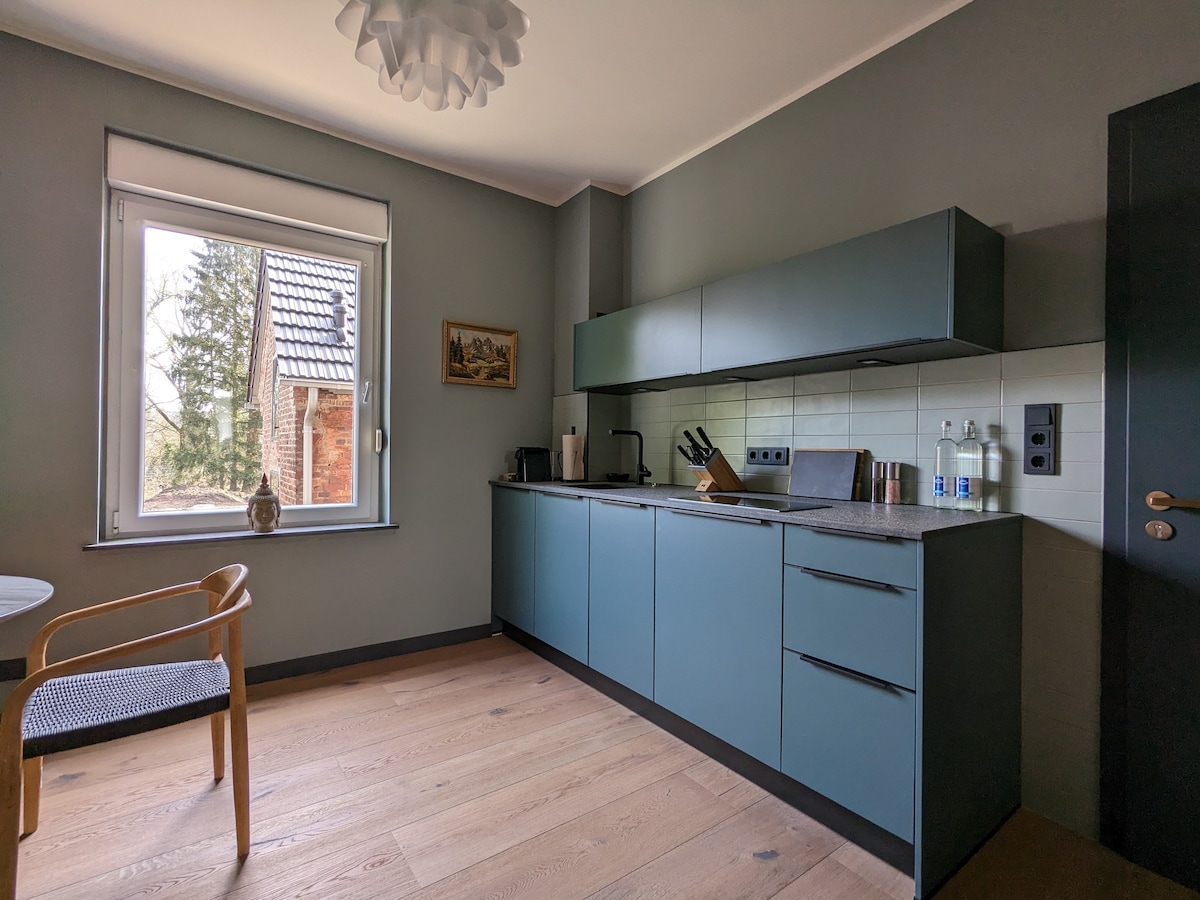 Det blå hus er et af 6 andre huse i en venlig, indhegnet gårdsplads og kun til dig alene. En stor eng, frugttræer og en solrig bænk foran huset inviterer dig til at blive hængende, lytte til fuglene eller bare nyde dagen. Gården er centralt beliggende i Bergisches Städtedreieck, ved foden af slottet, en flod flyder langsomt forbi den, og foran porten fører vandrestien ind i de fortryllende skove i Wupperberge.