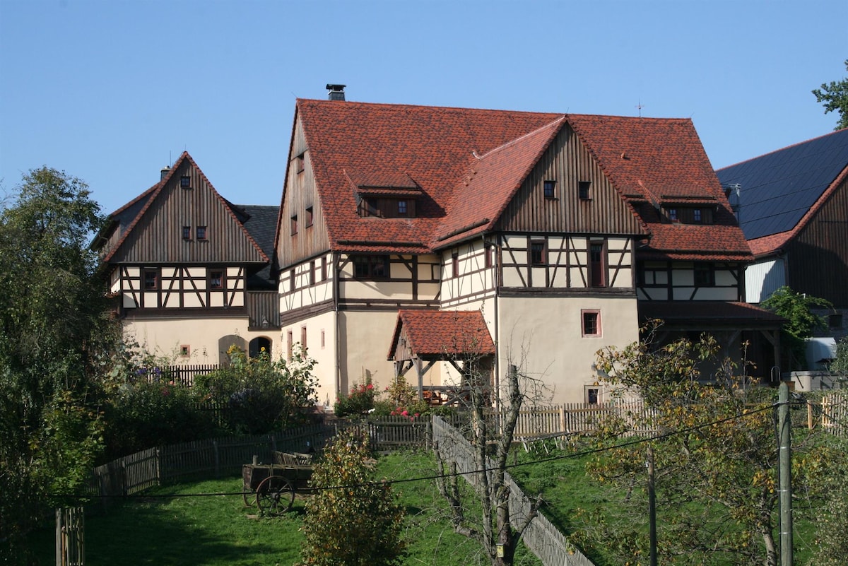 I en kærligt renoveret, fredet gård med tre indkørsel ligger gæstelejligheden i den øverste del af den tidligere staldbygning. Kun få skridt fra gården, og du er midt i det grønne: I den smukke Muldental inviterer landskabet og forskellige seværdigheder til lange gåture, cykelture og udflugter. Landsbyen Höfgen ligger mellem Leipzig og Dresden og er med sine fredede bindingsværkshuse en af de smukkeste landsbyer i Sachsen.