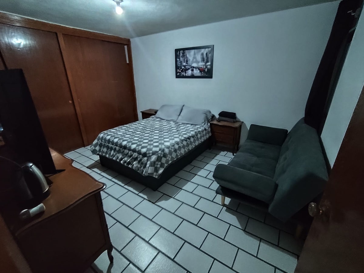 Habitación básica con cama matrimonial para huéspedes en lugar seguro, cerrado, con acceso a internet de alta velocidad. Estacionamiento dentro de la propiedad. Nos encontramos a 10 minutos del aeropuerto internacional del bajío a las afueras de la ciudad de Léon.