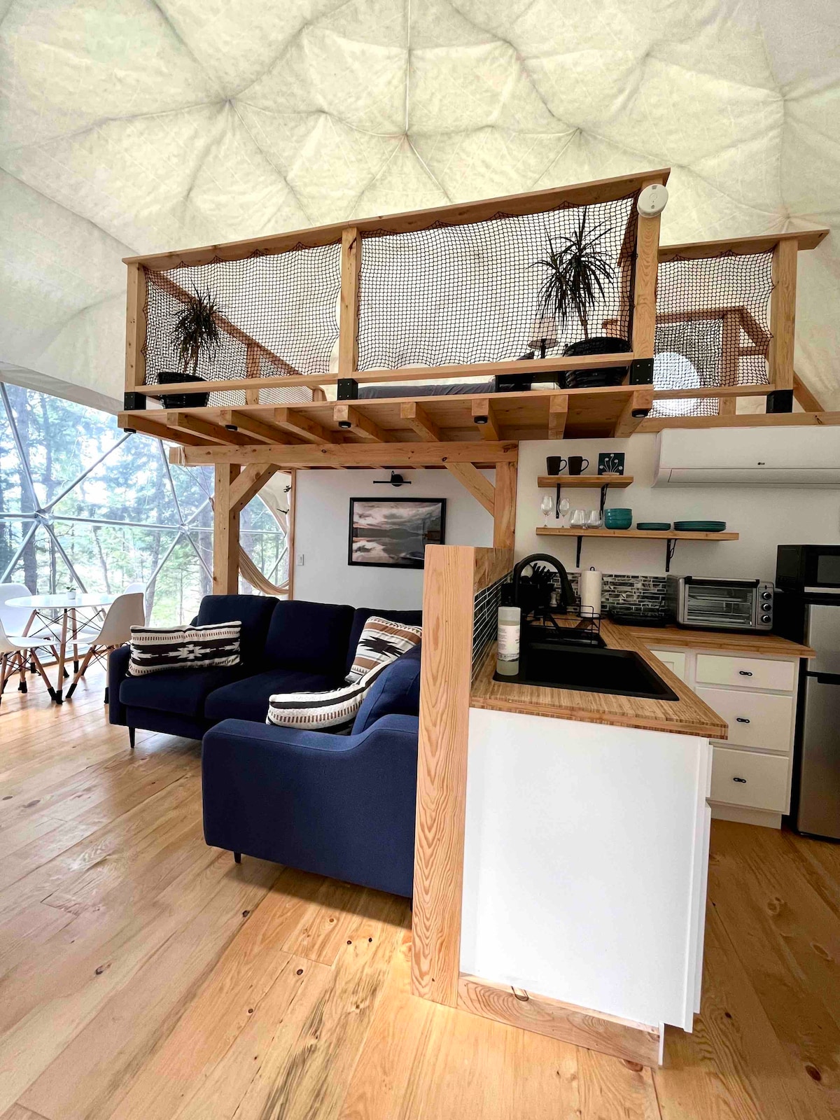 Flygt ud i naturen med et ophold i en af vores luksuskuppeler. Fuldt udstyret køkken med køkkengrej, service, redskaber osv. samt kaffe og te. Privat badeværelse med toilet, brusebad og basale toiletartikler. To queensize-senge med et loftsrum. Udendørsområdet omfatter en grill, privat elektrisk spabad og terrassemøbler. Kajakker er tilgængelige i sommermånederne samt en fælles bålplads. **Bemærk, at der er en kort gåtur ned ad en bakke for at komme til kuppelhuset**