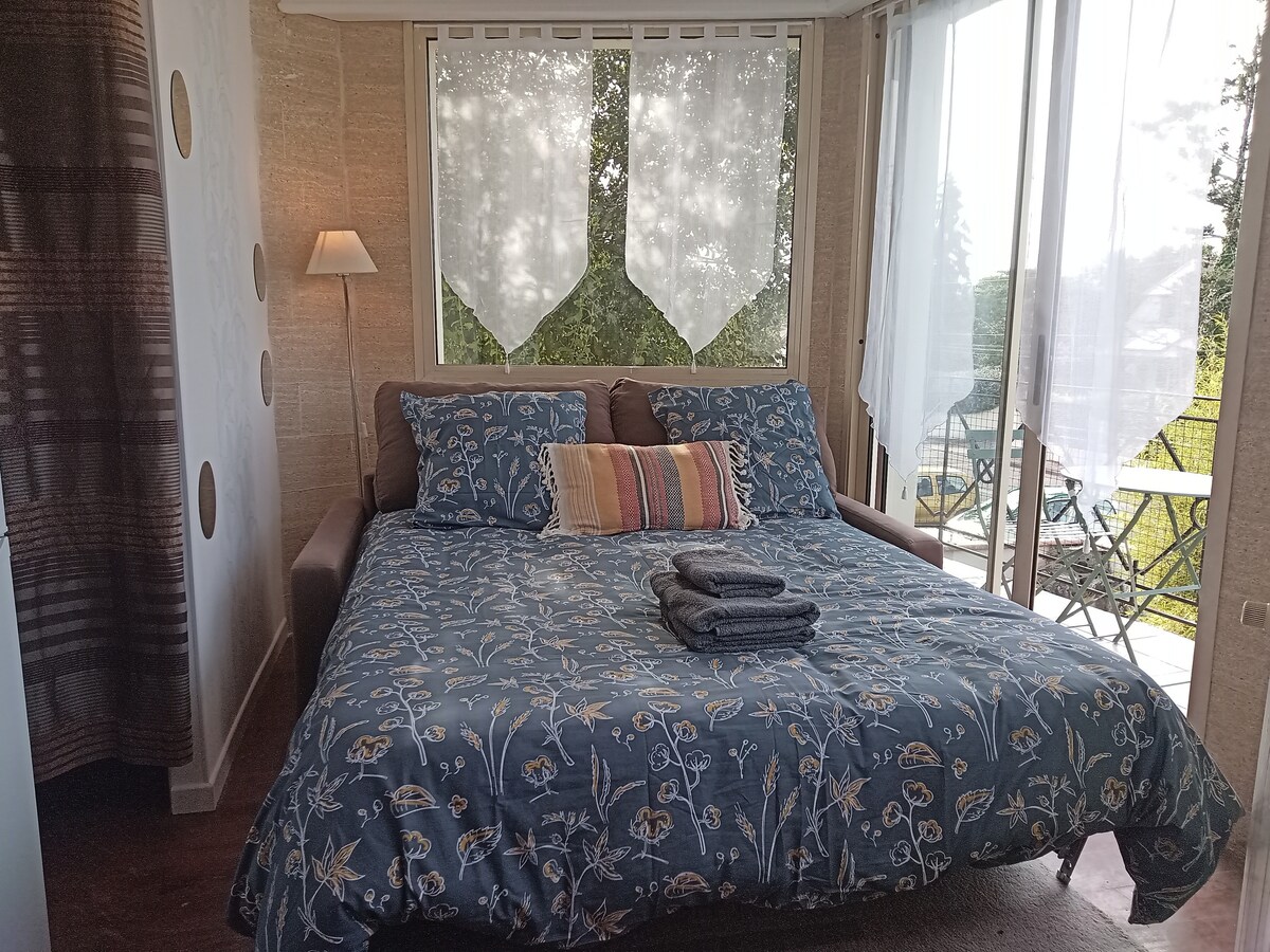 Inde i et familiehus, en komfortabel og uafhængig lejlighed på 40 m² (430 sqft) med en behagelig fælles have. Rummelig og veludstyret til 2-4 personer, vil du nyde en høj kvalitet senge, i og rent og smart sted. Gratis og sikret wi-fi Gratis og privat parkering. 10 minutter i bil: indkøbscenter, togstation og lufthavn, musikhal, skov, .... 10 minutter til fods: små butikker, minigolf, swimmingpool, ... Rygning forbudt!