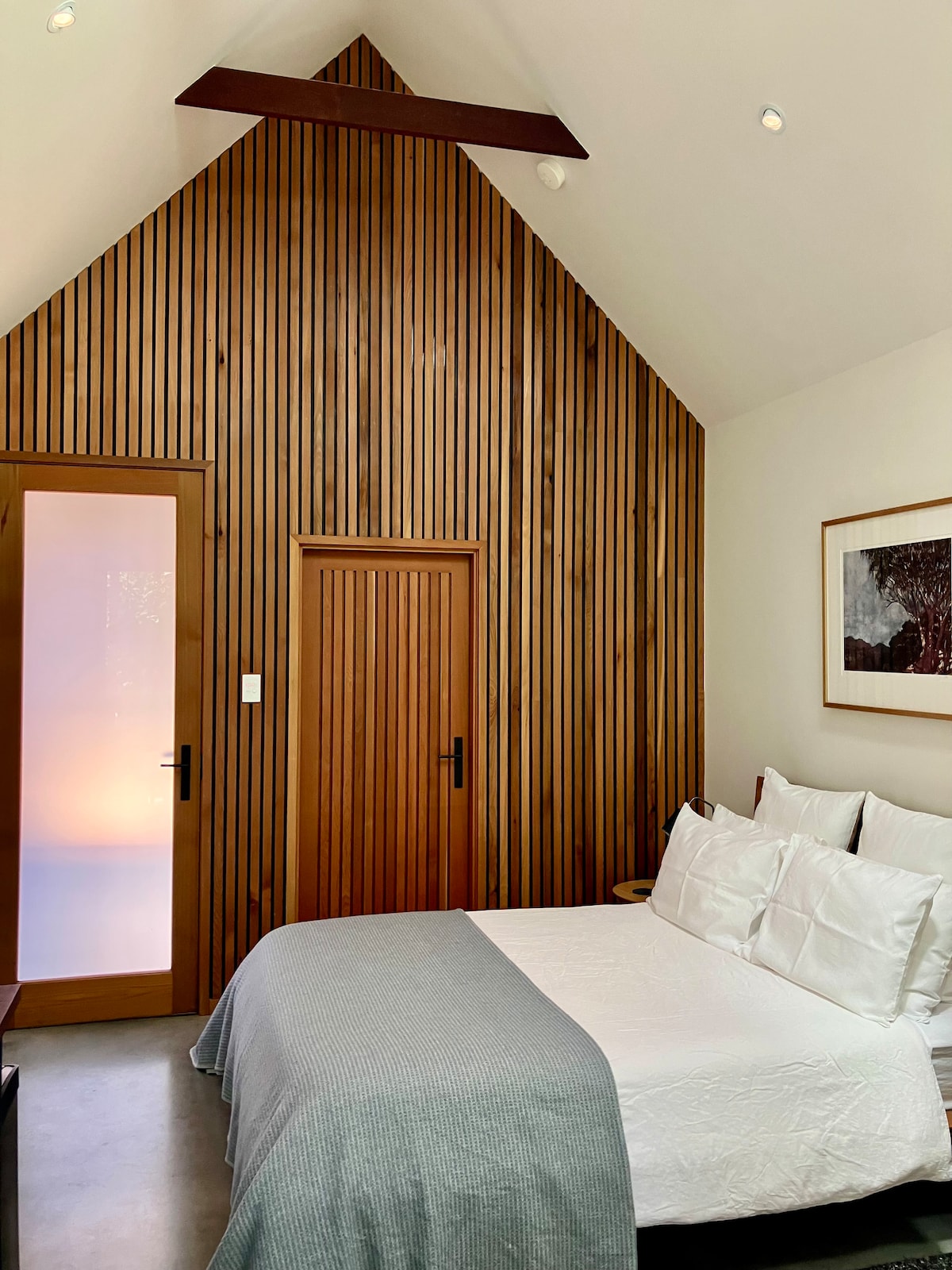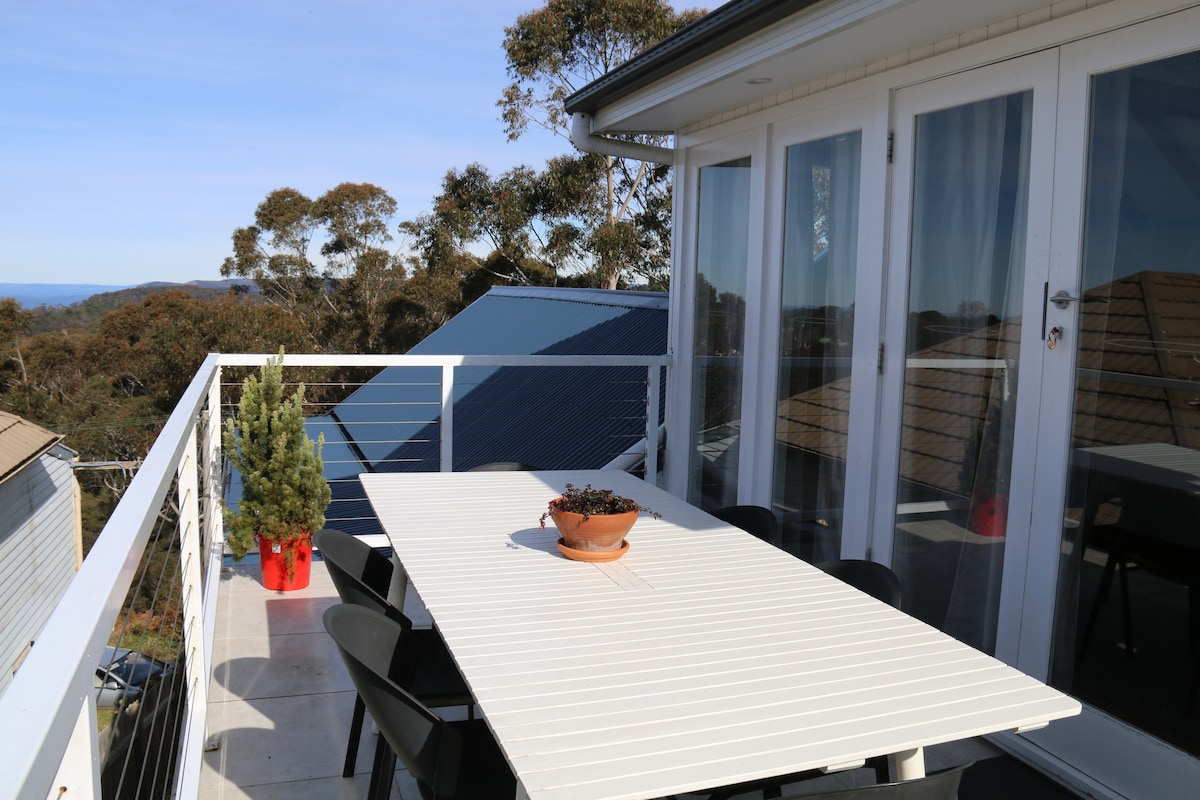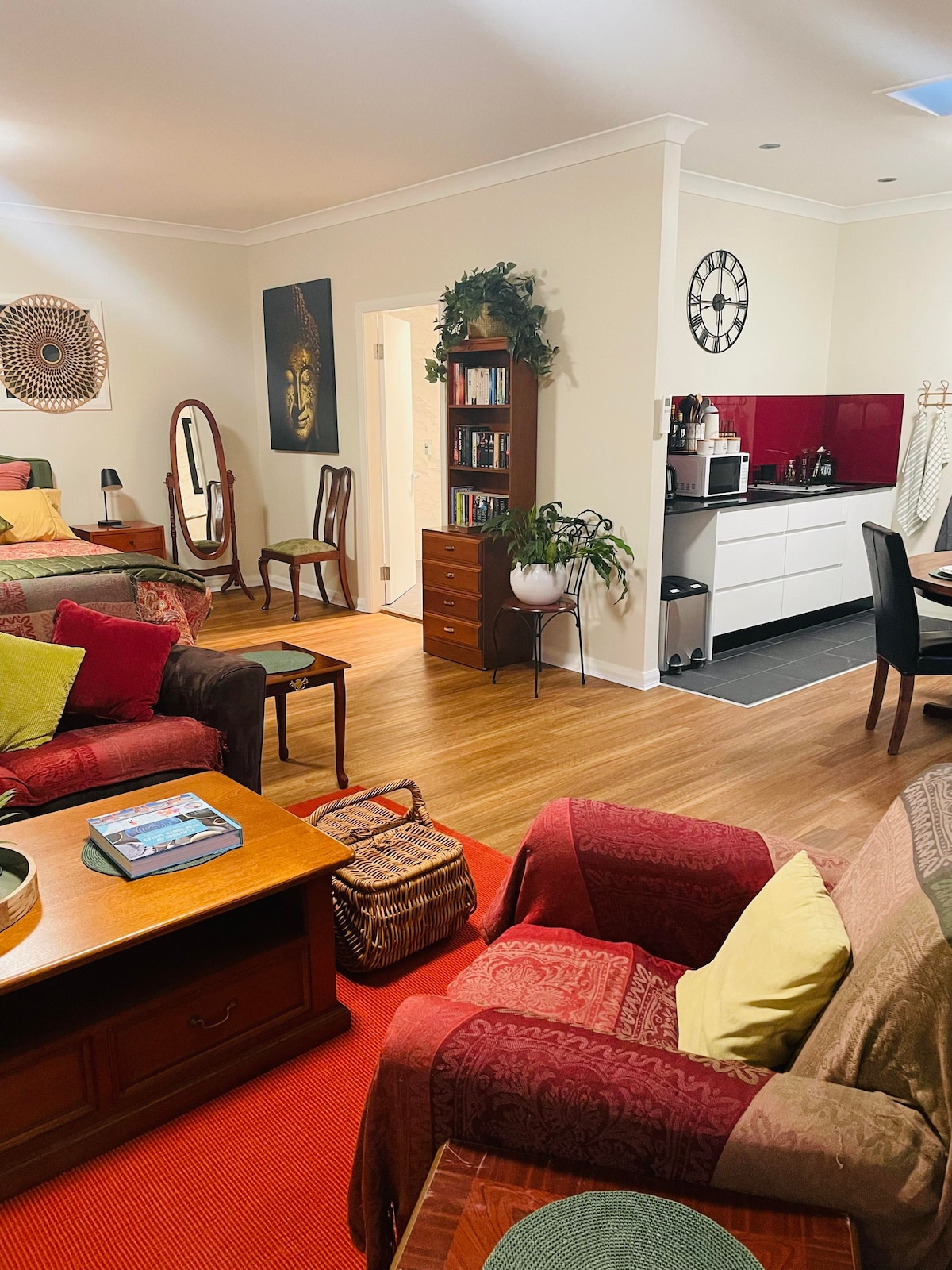 Studio White ligger foran en nybygget arkitektdesignet bolig. Det er moderne og rummeligt med en loftsmesanin over opholdsområdet og er tilgængeligt via italienske spiral trapper. Det nederste opholdsområde har en pejs, der åbner op til en stor terrasse med udsigt over haven og dammen. Vi bor stille i en meget separat del af bygningen. Den er smagfuldt indrettet med nogle særlige detaljer, der minder dig om, at du er i de smukke Blue Mountains.