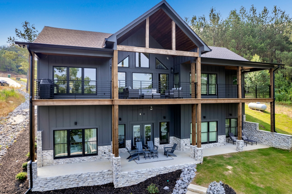 Velkommen til din luksuriøse hytte ved søen i et privat lukket område! Dette brugerdefinerede hjem på nabolagets førende pointparti har 5 soveværelser, 3,5 badeværelser (soveplads til 14 gæster), 2 stuer og kan prale af uberørt 270 graders udsigt over søen fra næsten alle rum. Nyd en ægte hyggelig søferiefornemmelse med designer- og RH-indretning, privat båddock, 4 kajakker, 3 SUP'er, udendørs køkken og Adirondack-omgivet bålsted blandt træerne!