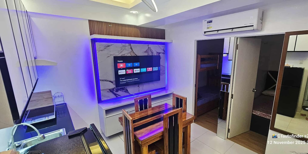 La Joya-suiten – din perle af en staycation i Naga City, Camarines Sur Oplev det bedste af Naga City med denne stilfulde moderne lejlighed beliggende i %{smart Sentrio i nærheden af SM Naga. Nyd nem adgang til shopping, spisesteder og underholdning. Lejligheden har nyrenoveret interiør med et åbent soveværelse, komfortabel sofa, spisebord, 55 "smart-tv, fuldt udstyret køkken og en rummelig balkon.