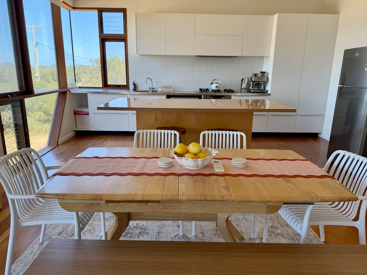 Lys, lys og rummelig. Fra det øjeblik du kommer ind, vil du føle dig rolig og afslappet. Tænd brænde ild, eller tryk blot på en knap for øjeblikkelig varme eller kølig. Komfortable Koala-madrasser på senge er også udstyret med elektriske tæpper. Rene, hvide stenbænke og en stor kogeplade og ovn, hvis det er din plan at spise i. Stilfulde og komfortable opholdsrum. Strømlinet badeværelse og eget badeværelse, hver med en stor brusebad med glasvægge. Nyd det græsbevoksede forreste dæk, eller sid omkring bålpladsen bagved.