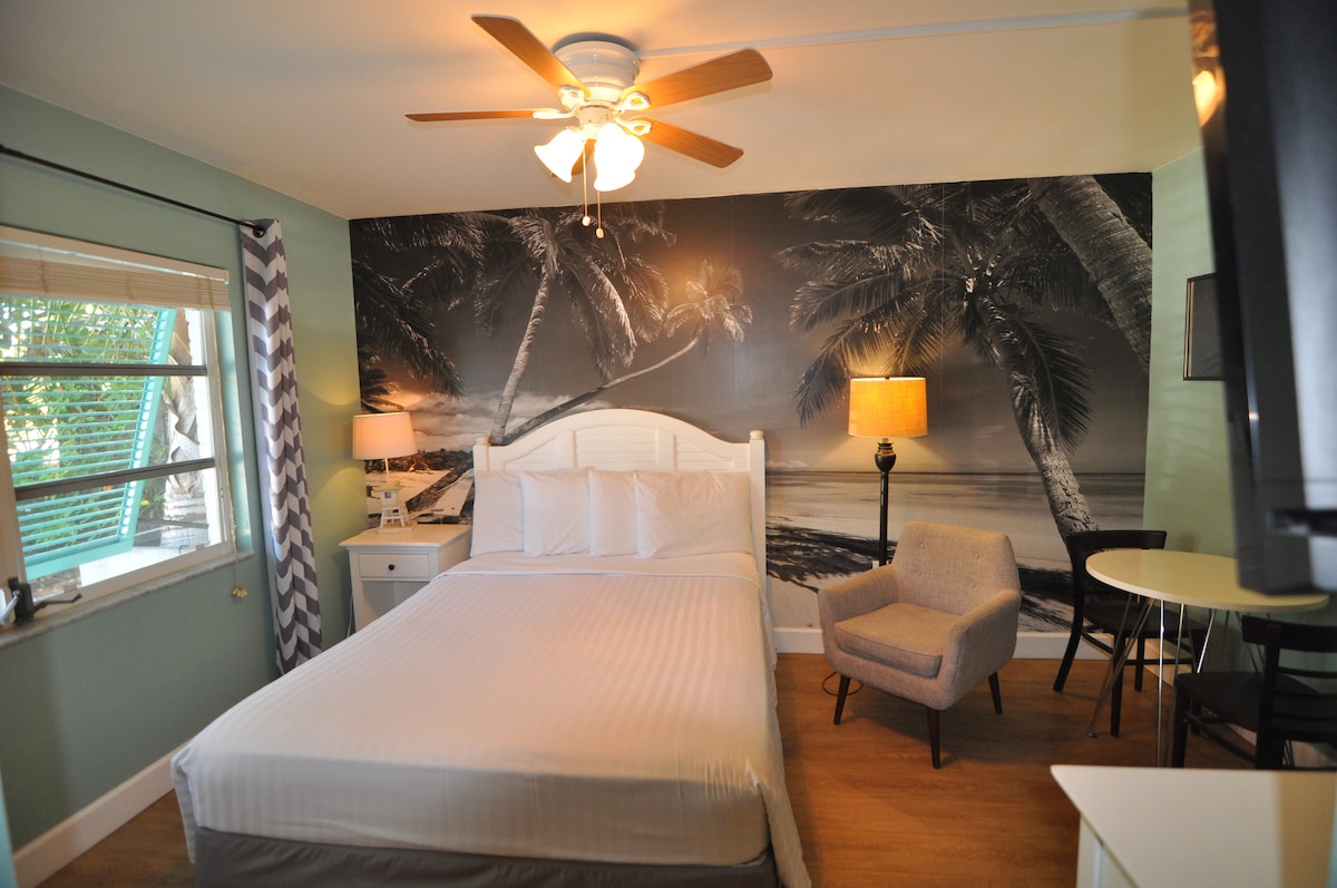 Palm Tree Villas tilbyder en portefølje af unikke 1950'er resort-værelser lige fra etværelseslejligheder til 2-værelseslejligheder med 2 badeværelser. Vi vil meget gerne være vært for en vidunderlig malerisk ferie. Praktisk tæt på sporvognen, så du hurtigt kan få en bid mad på mange gode spisesteder rundt om på øen, og en kort gåtur fra stranden. Ingen bil påkrævet. Dette tilbud er et lille atelier, der er ekstremt populært. Der er to studiolejligheder til rådighed. Tilbyder 1 tildelt parkeringsplads. Holme Beach VRC24-000043