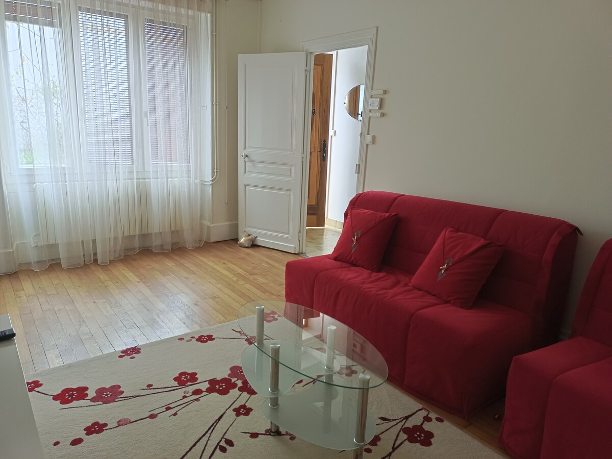 Lejlighed på 41 m2 i centrum af Bourges. Beliggende på 1. sal Tæt på restauranter og byens centrum Består af: - 1 klimatiseret stue med sovesofa 140X200 - 1 fuldt udstyret køkken - 1 soveværelse med aircondition og 1 seng 160 x 190 - 1 badeværelse med bruser, vaskemaskine og tørretumbler - 1 værelse med en BZ sofa, der kan laves om til en seng 140X190 Derudover: Wi-Fi, Netflix, Amazon Prime, barneseng. Ingen privat plads, men gratis parkering, fleksible åbningstider, når det er muligt